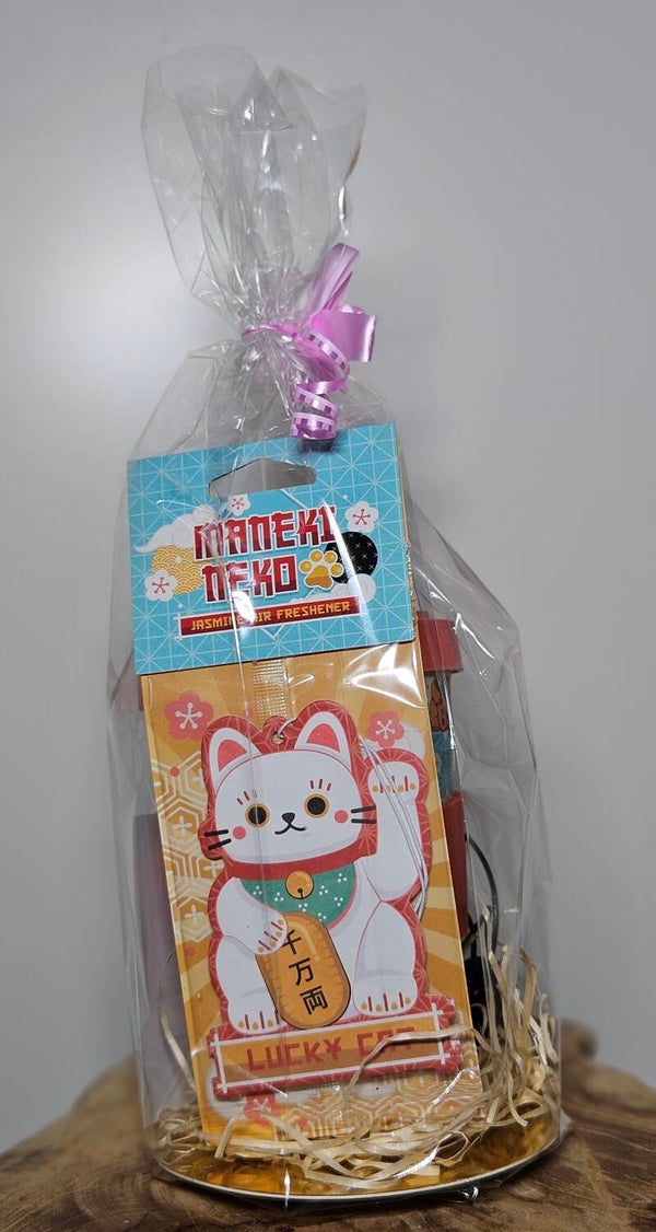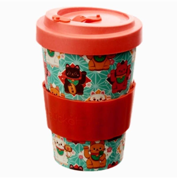 - 1x thermobeker van bamboe met gelukskatjes. Afmetingen 14x 9,5x 9,5 cm. De inhoud is 400ml. Vaatwasser bestendig