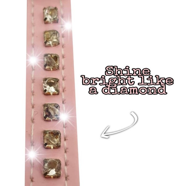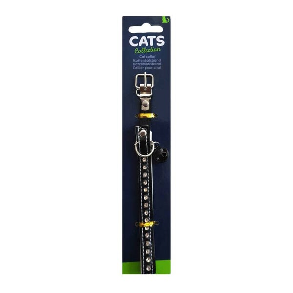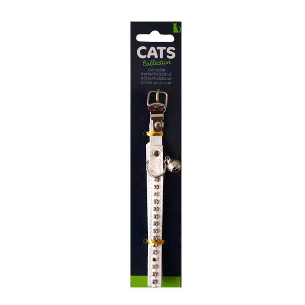 Leuk halsbandje met belletje en veel blingbling voor een echte diva poes of moderne kater. De halsband is verstelbaar door middel van gaatjes. In ieder geval geschikt voor volwassen katten. De totale lengte is 30 cm. Met veiligheids elastiek zodat de kat makelijker los kan komen, mocht deze ergens aan vast komen te zitten.