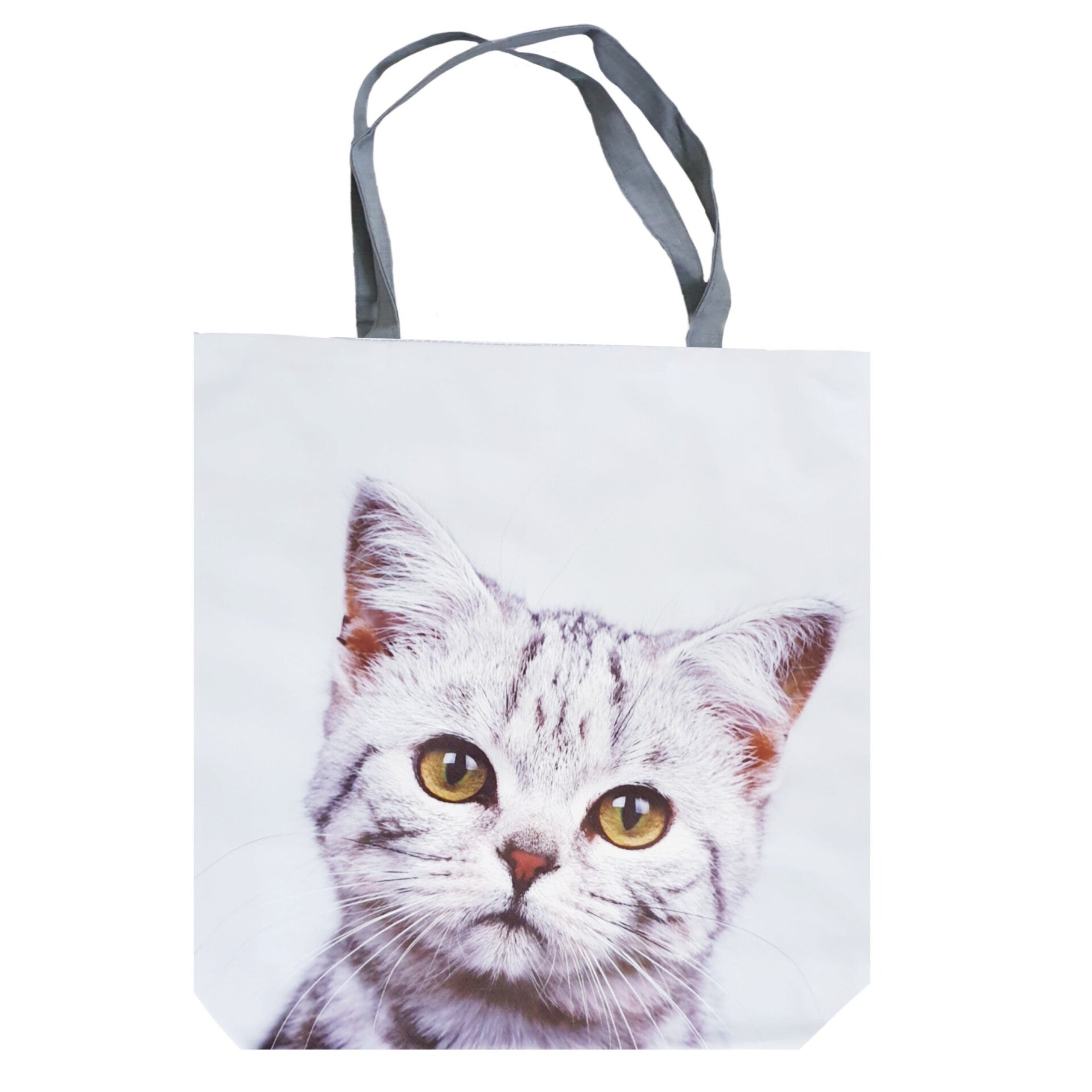 Kunstleren en stoffen tas met kattenprint, ritssluiting en binnenzak. Enkelzijdig bedrukt.