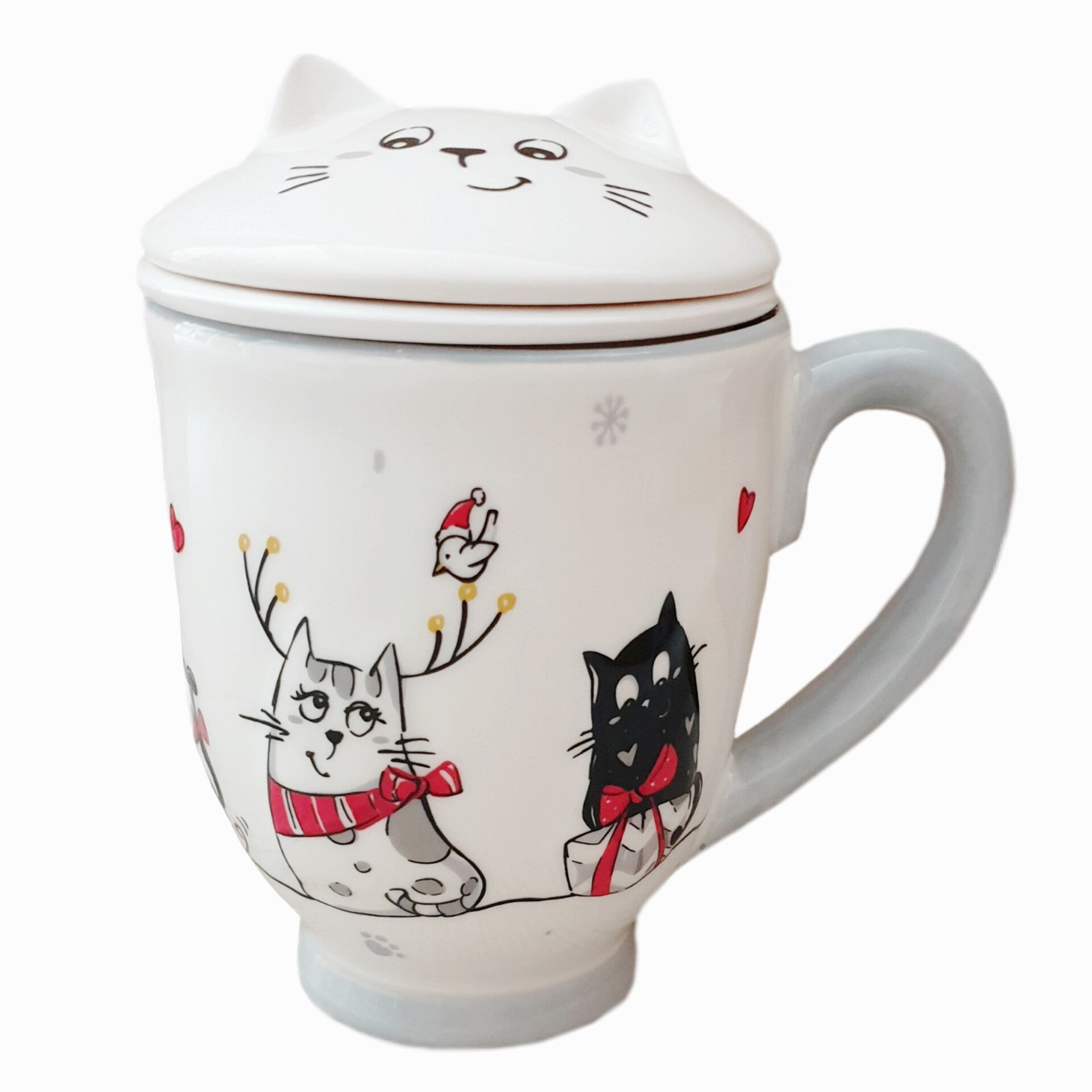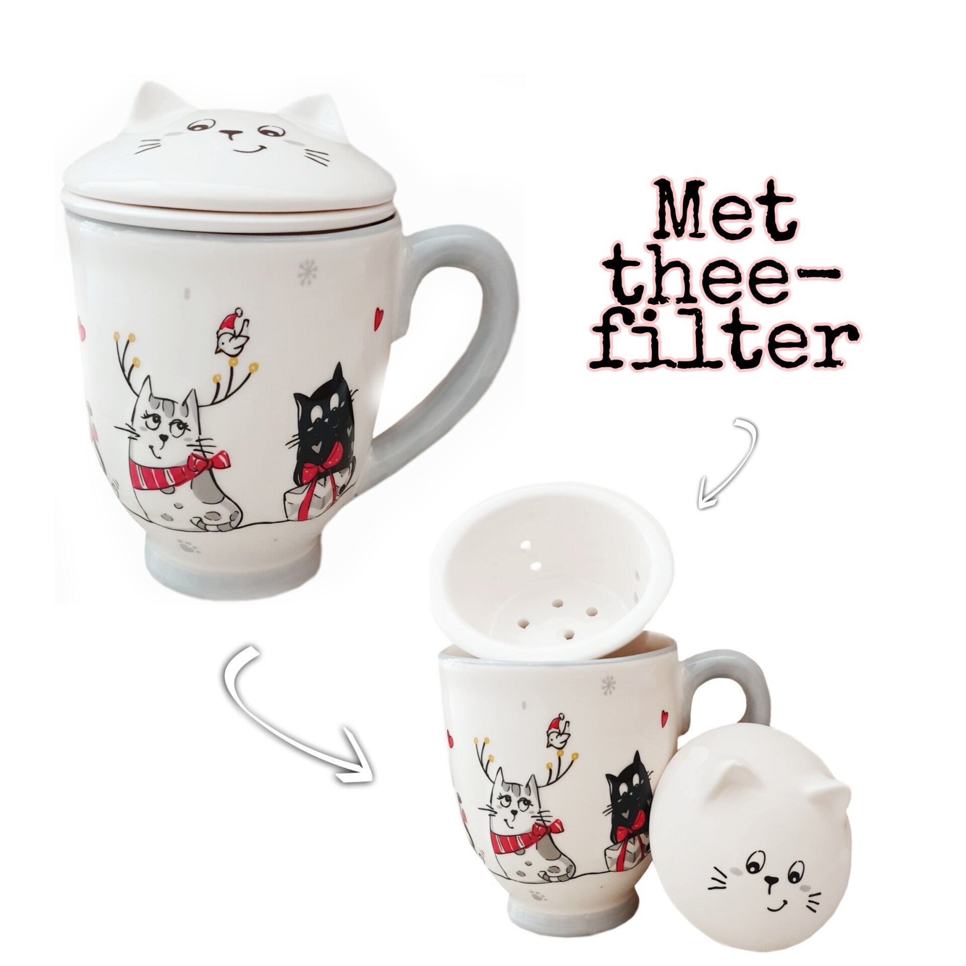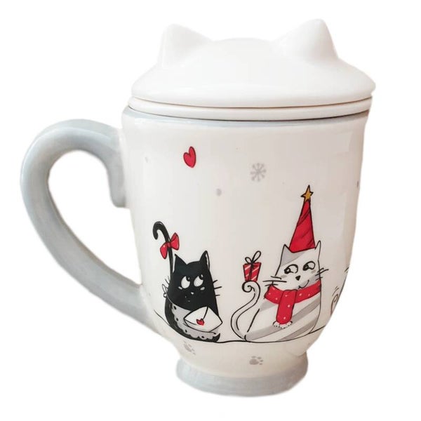 Keramische beker met een uitneembaar filter om thee in te laten trekken. Door middel van de deksel blijft de thee lang warm. Met leuke kerstprint.