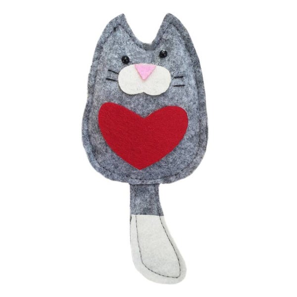 Katjes gemaakt van vilt met een visdraad touwtje om ze op te hangen. Door het vilt en de afwerking krijgen ze een echte handgemaakte look.