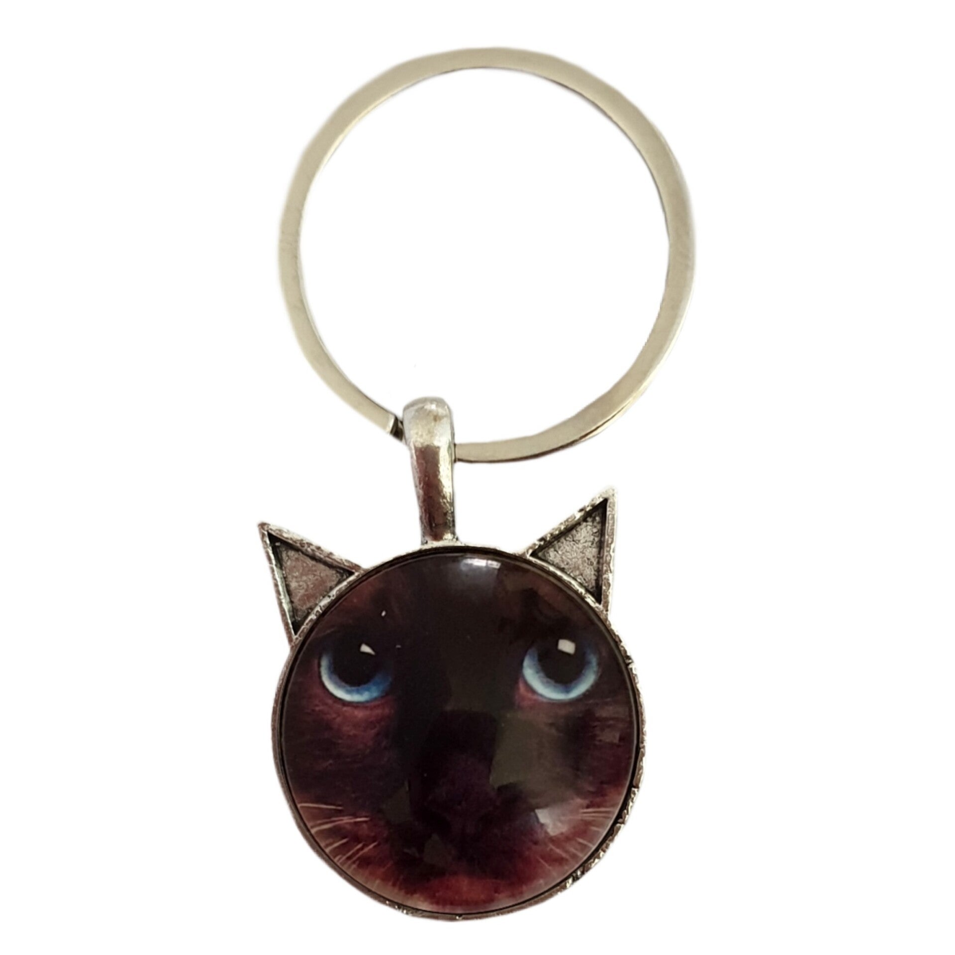 Korte sleutelhanger met kattengezicht en grappige oren. De sleutelhanger is gemaakt van metaal en is verkrijgbaar in de kleuren antiek-zilver of zilver. Kleur zoals afgebeeld is antiek- zilver. Het kattenhoofd is gemaakt van glas en heeft een diameter van 2,5 cm. De totale lengte van de sleutelhanger is circa 5 cm.