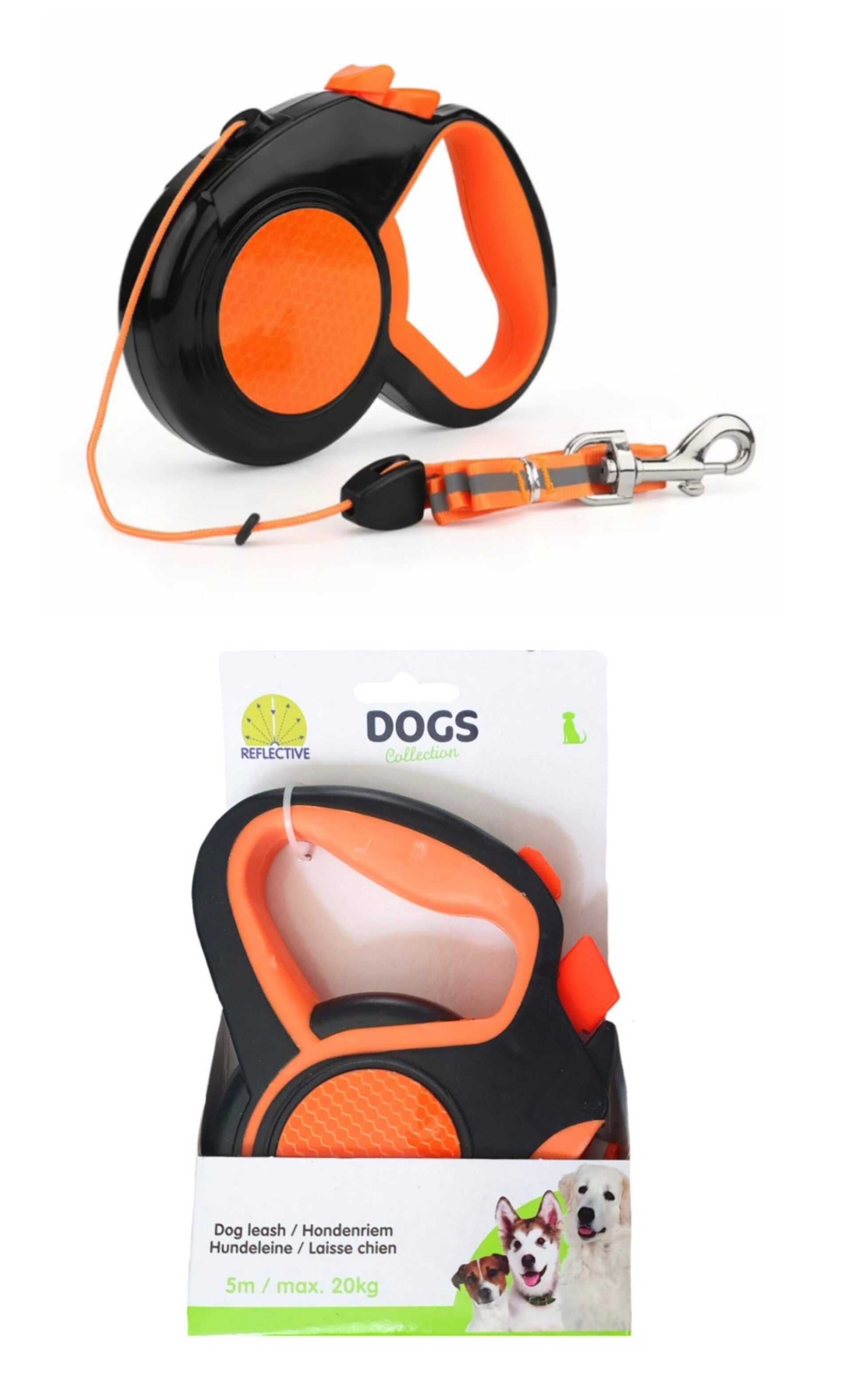 Automatische looplijn zodat je hond mee vrijheid heeft tijdens de wandeling. De lijn kan uitrollen tot 5 meter. De lijn is een oranje draad en heeft een stukje reflectiestrip bij de aanhechting van de riem, welke oplicht als er bijvoorbeeld koplampen op schijnen. Dit geldt ook voor het handvat.