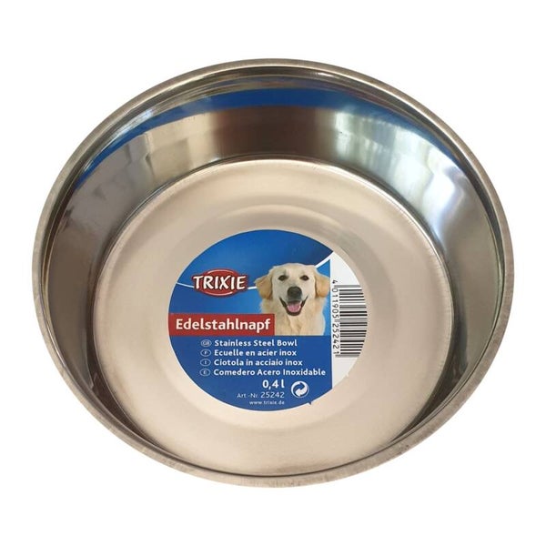 Voerbakje met versierde rand gemaakt van RVS. Aan de onderkant zit een anti-slip ring zodat de bak goed blijft staan.