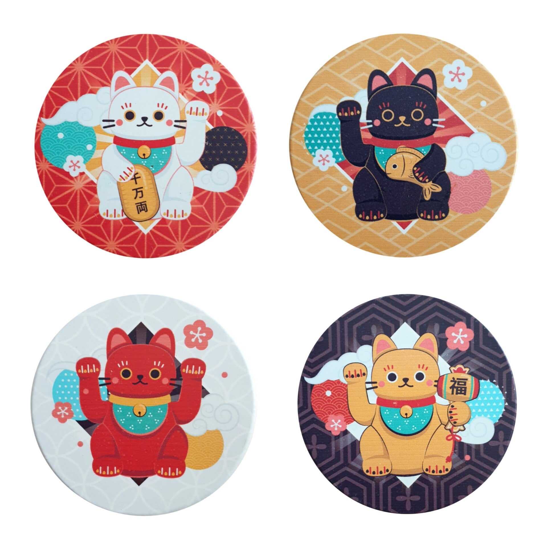 Onderzetters met 4 verschillende designs. De onderzetters zijn gemaakt van hout en hebben een diameter van 10 cm.