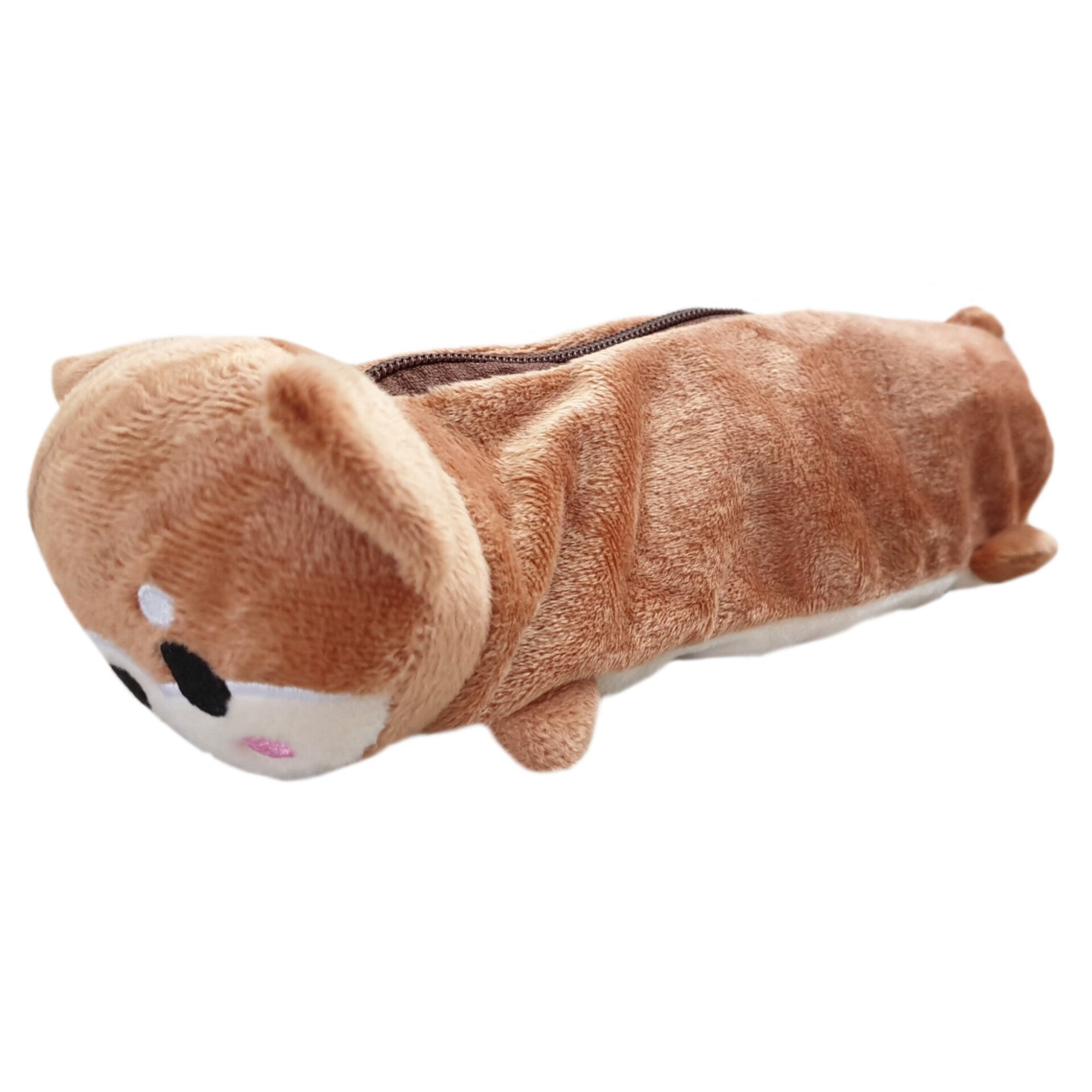 Zachte pluche etui met de vorm van hond. Sluit door middel van een rits op de bovenkant.
