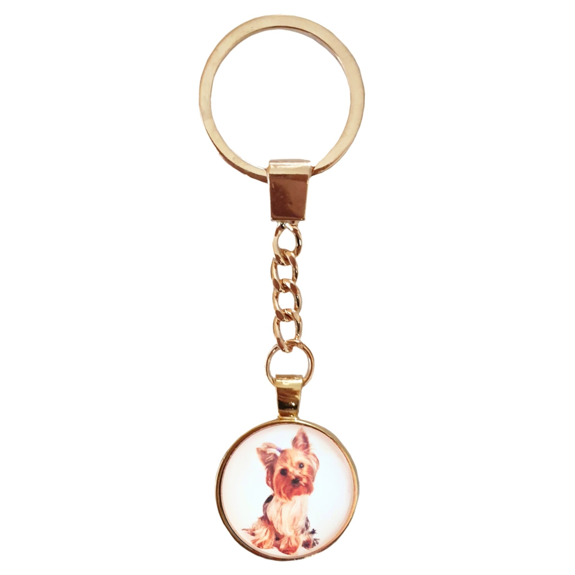 Sleutelhanger van metaal met met een gold-look kleur. De afbeelding is van glas.
