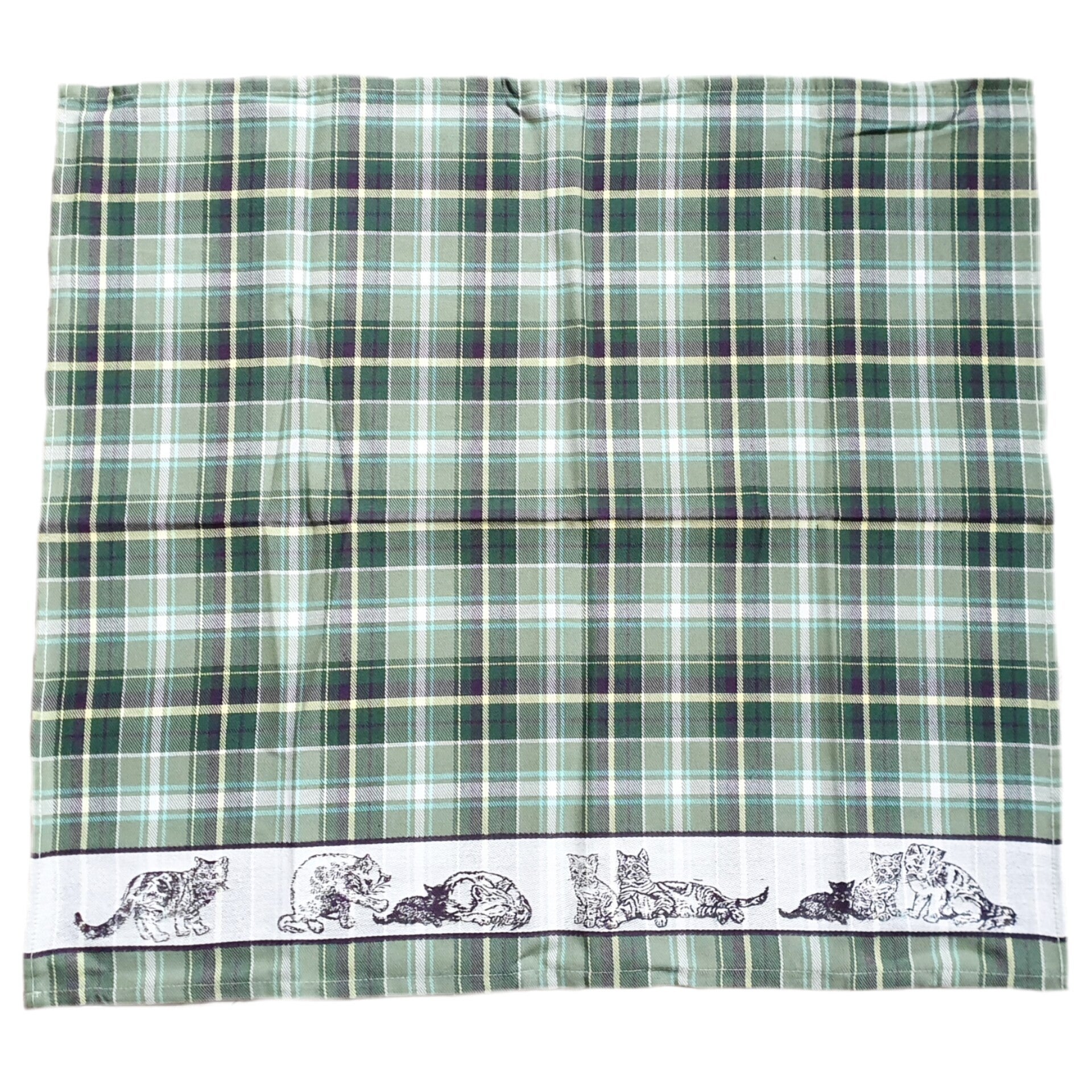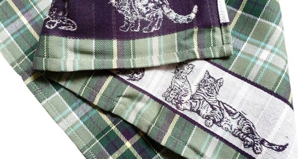Keukendoek met ruitmotief en een gestikte band met poezenafdruk. De keukendoek is van 100% katoen.