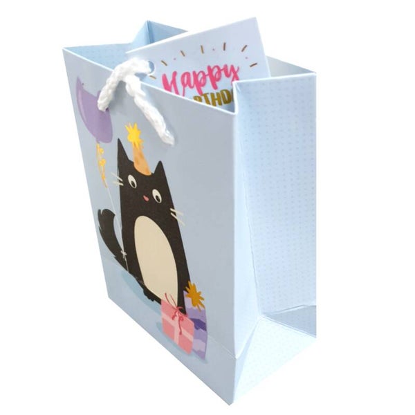 Verpak je cadeau leuk en snel met dit cadeau tasje van papier. Het tasje is versierd met een feestende kat en op de achterkant een gebakje.