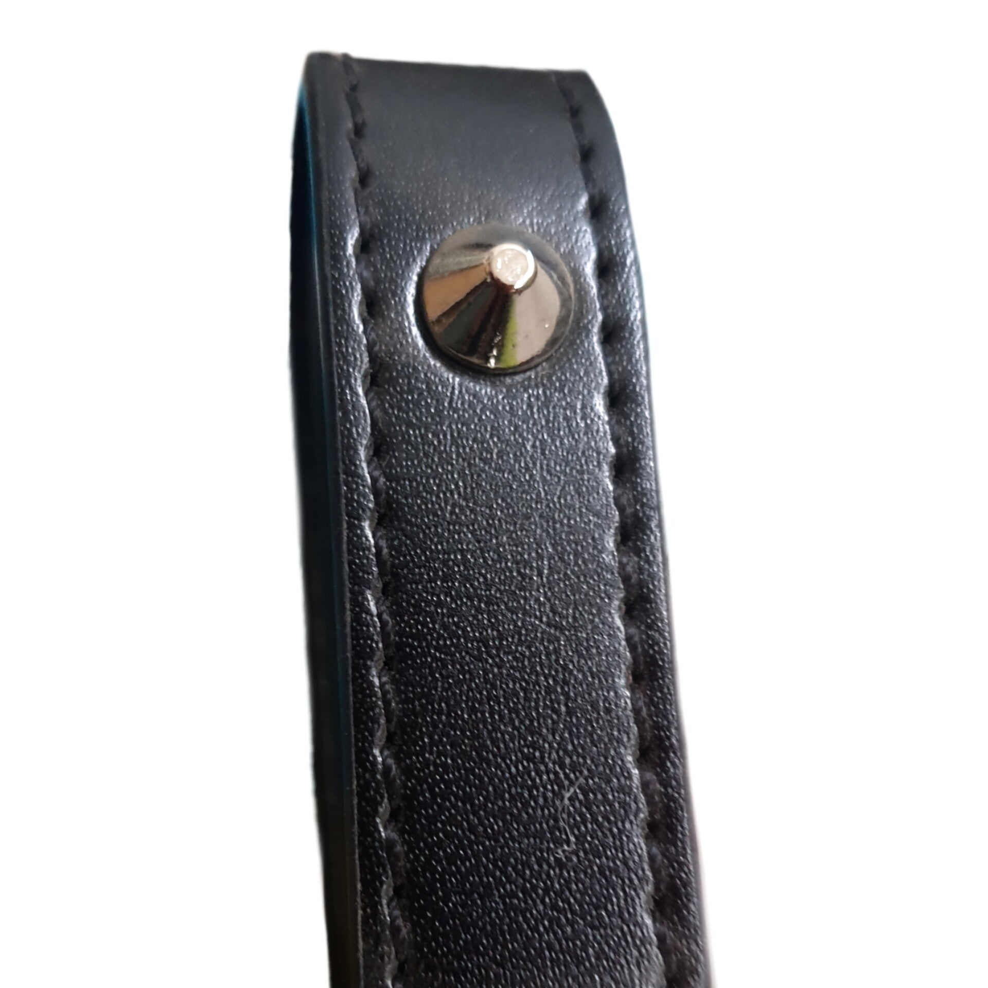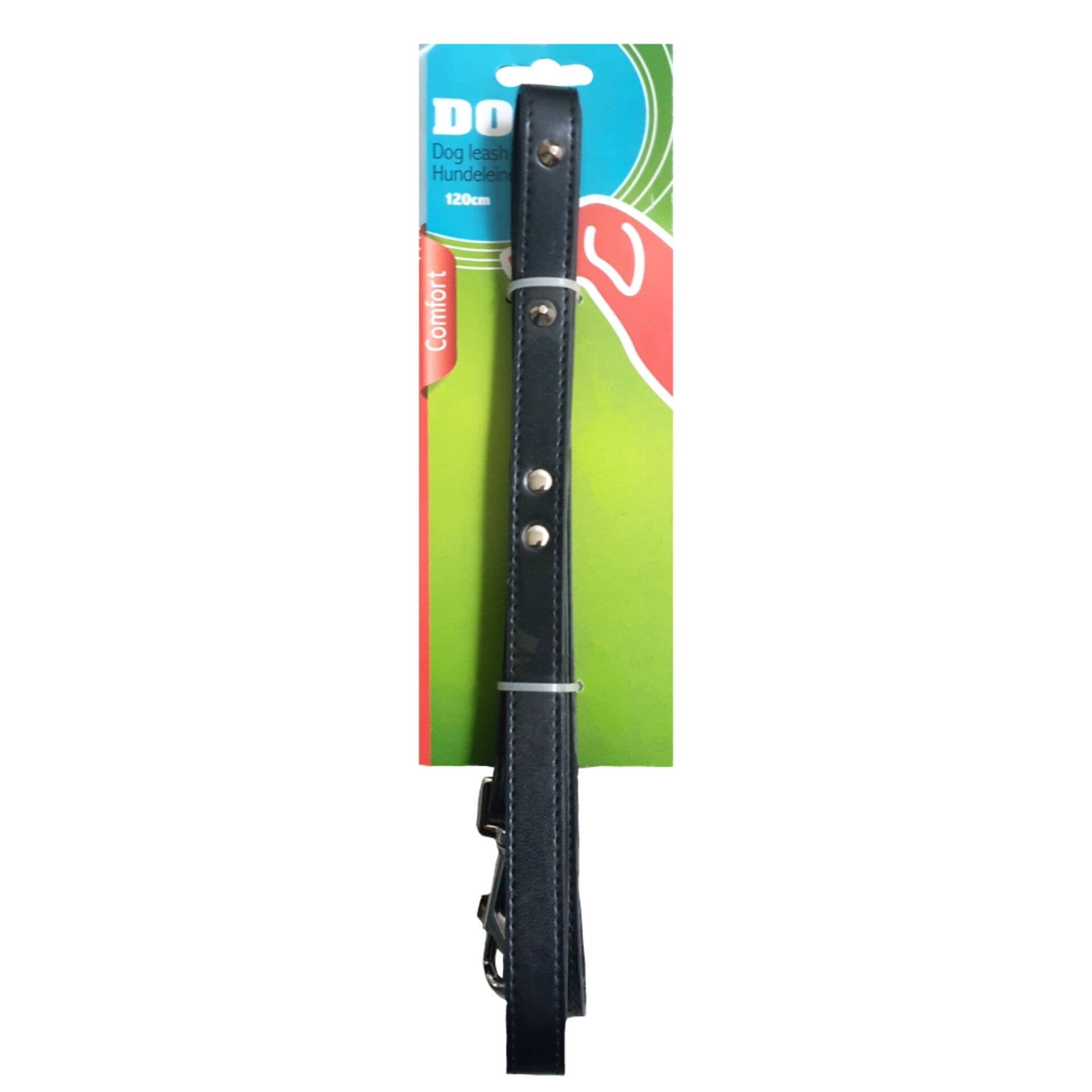 Hondenriem van zwart kunstleer. Aan het begin van de riem zitten 3 studs voor een stoer effect. De rest van de riem is neutraal.