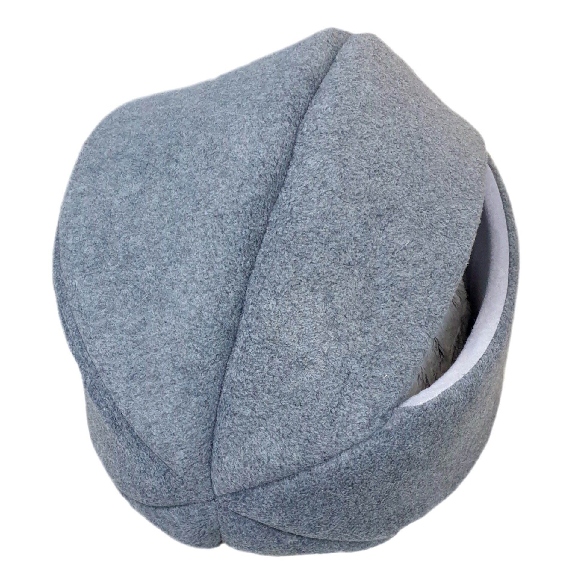 Leuk rond holletje met een nauwe ingang waar katten zich lekker in kunnen verstoppen. Met een uitneembaar wit/ zilverkleurig zacht kleedje. Eventueel ook te gebruiken als open mandje, zie foto's.