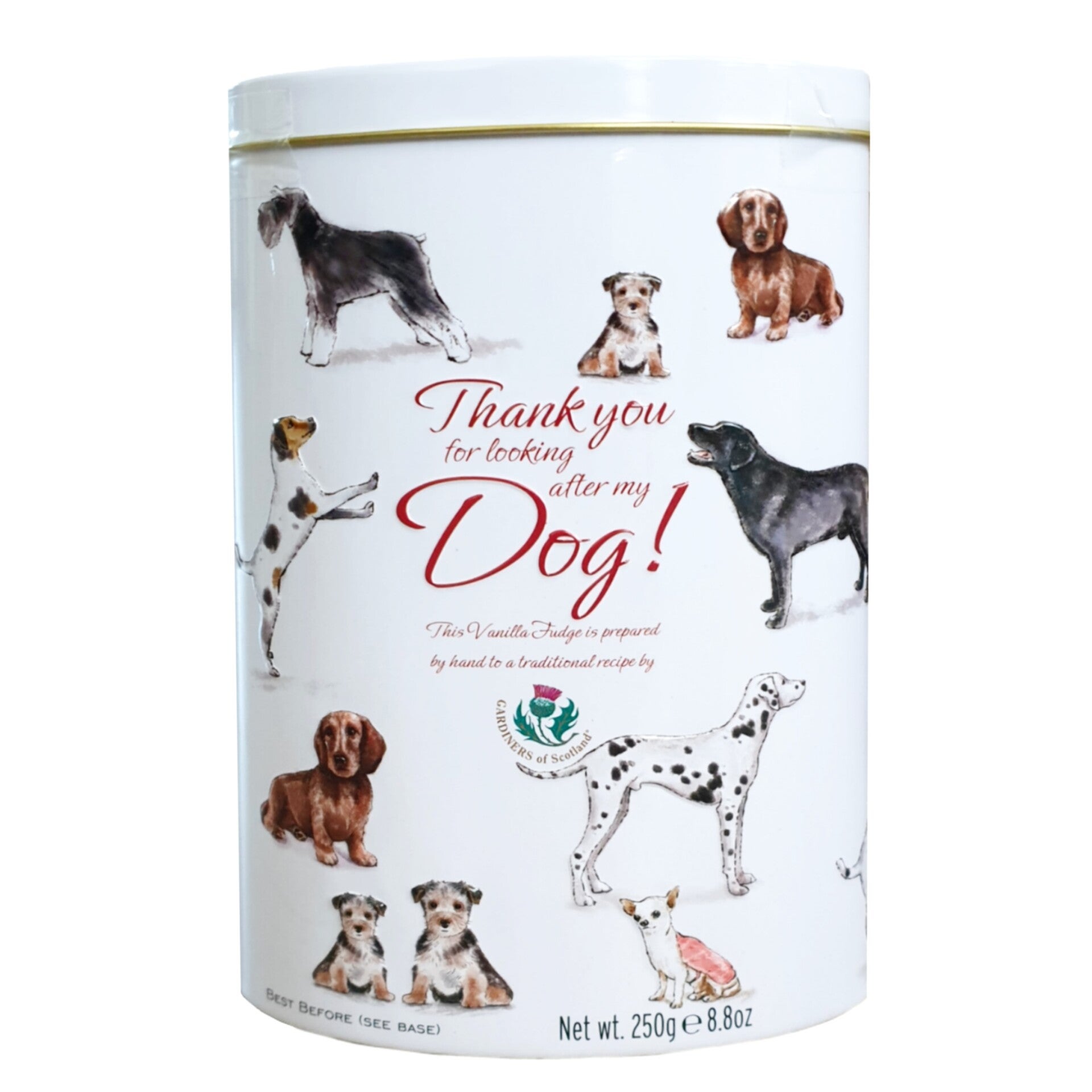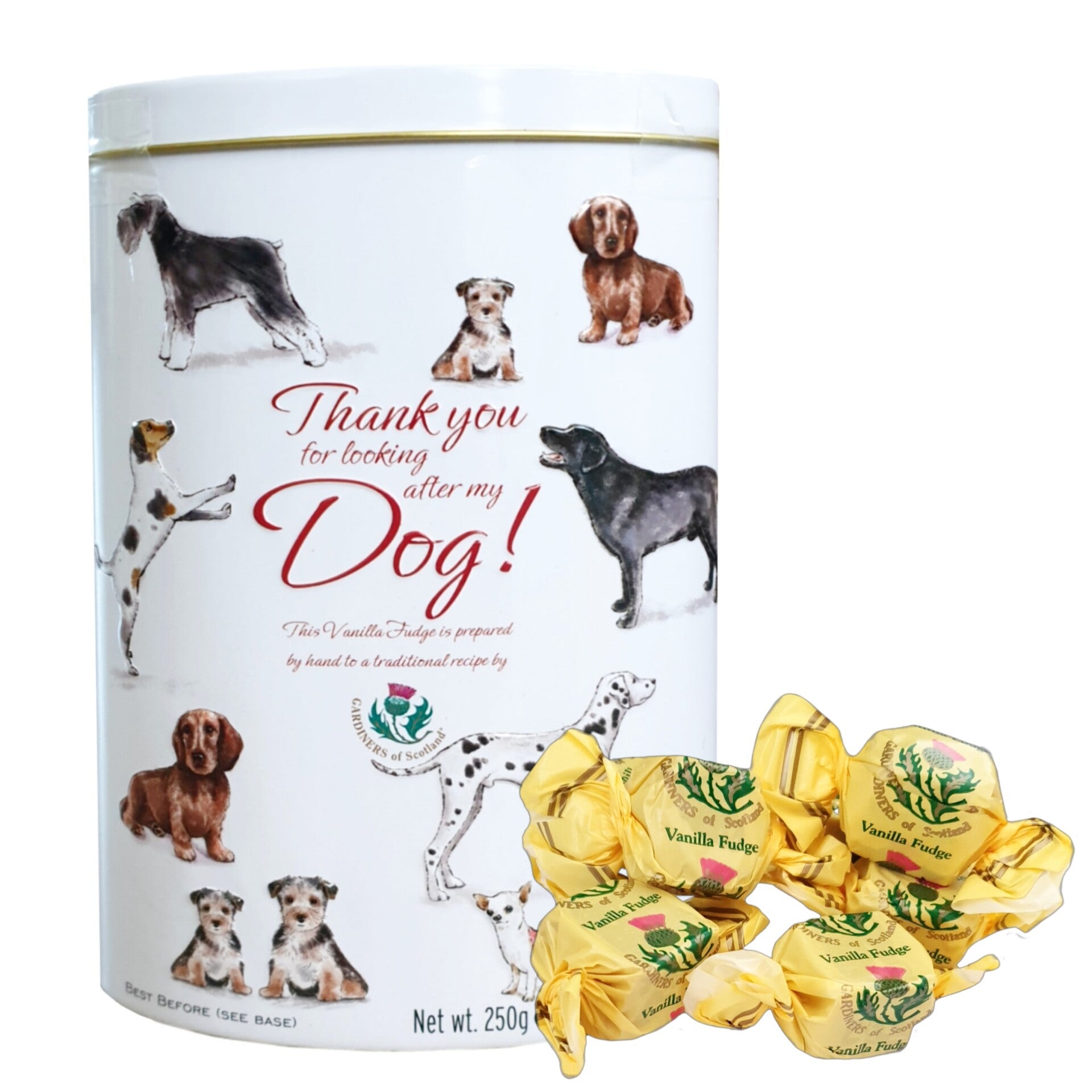Leuk blik gevuld met 250 gram heerlijke echte Engelse vanille fudge. Met de tekst "Thank you for watching my dog", dus leuk als cadeau voor iemand die (heeft opge)past op je hond.