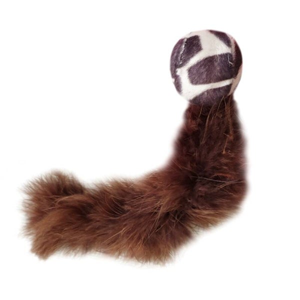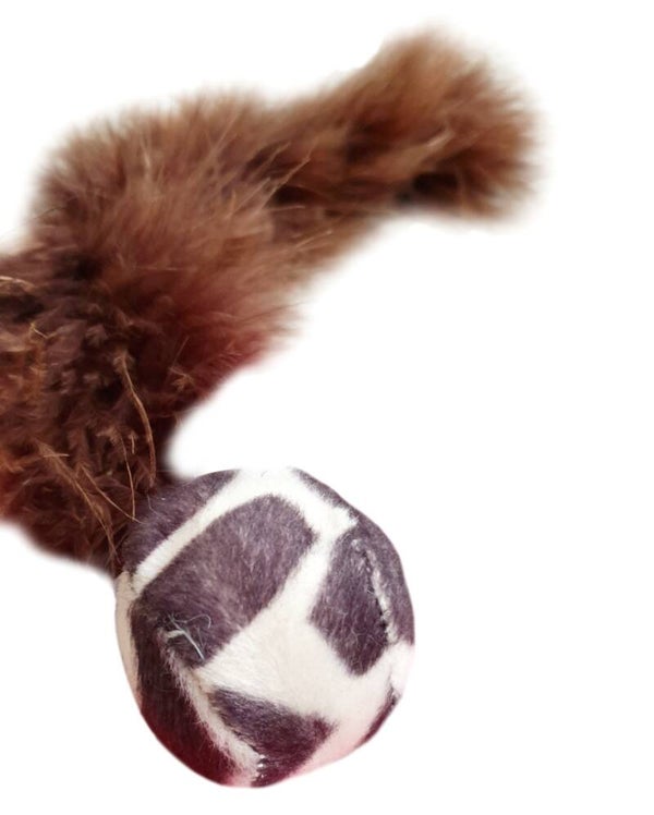 Balletje met een lange superzachte staart. Om het jachtinstinct te stimuleren. Het balletje heeft een diameter van 4 cm.De totale afmetingen zijn 25x 4x 4 cm.
