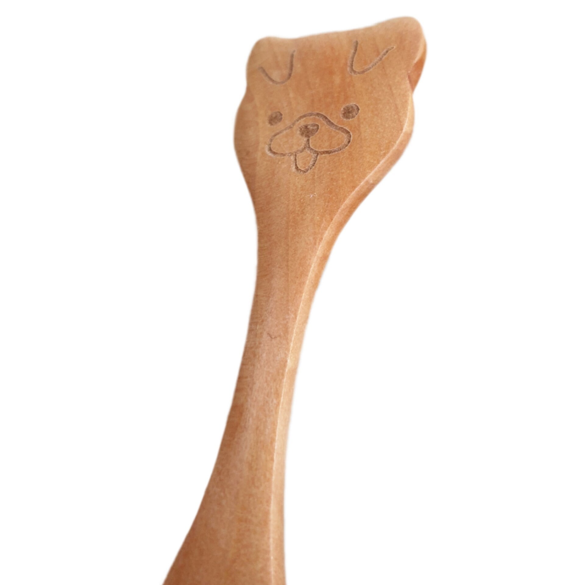Lepel van hout met een ingegraveerde print van een hondenkop. Geschikt om de koffie mee te roeren, of om kleine gerechten mee te eten.