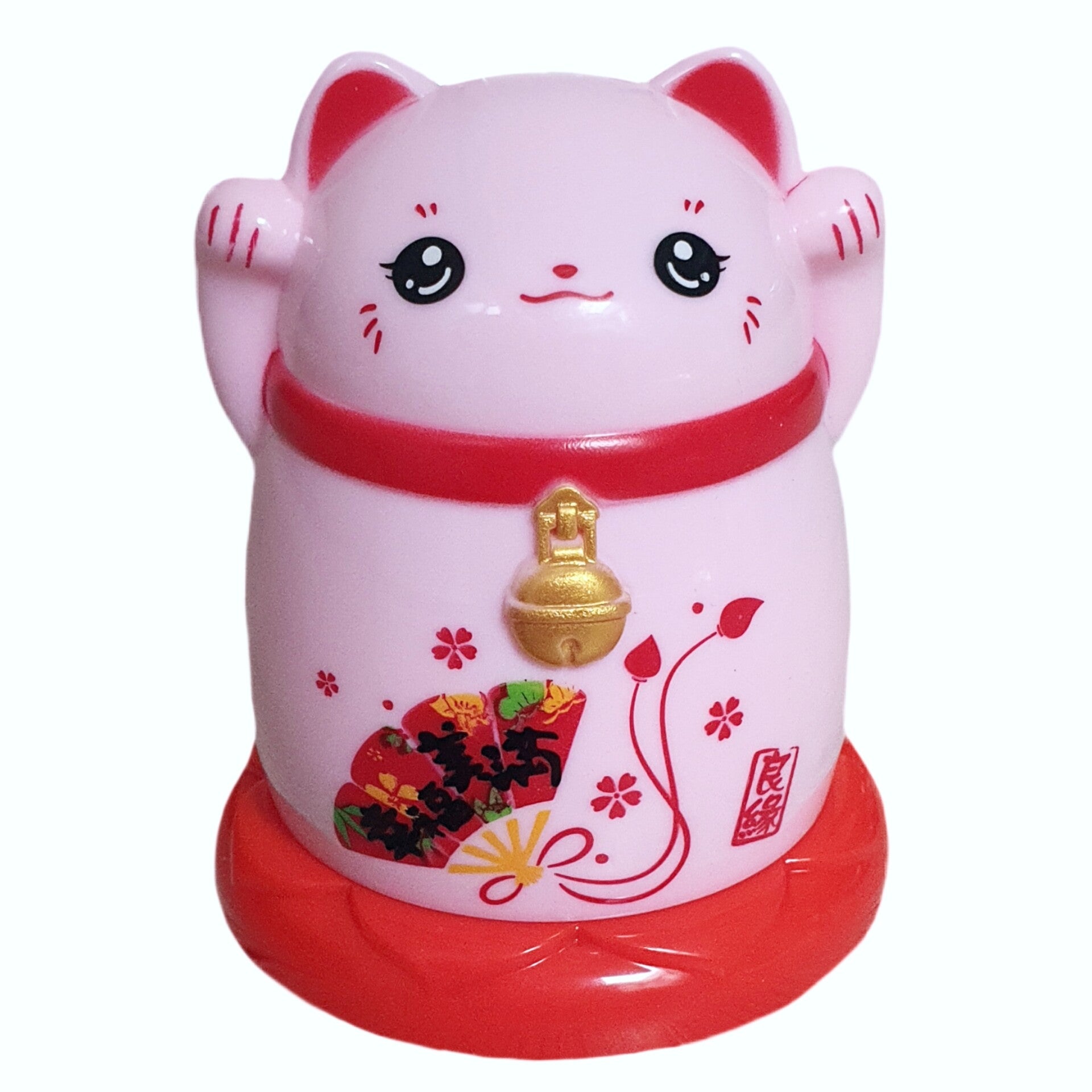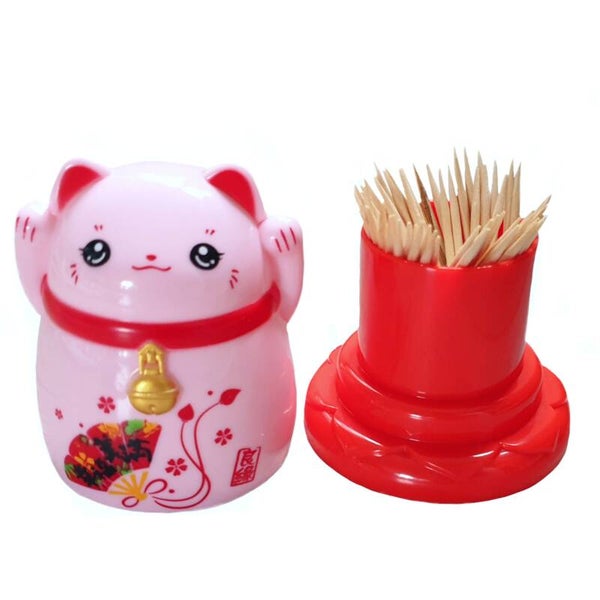 Plastic tandenstokerhouder (of voor een andere vulling) in de vorm van een gelukskat. Leuk accessoire voor op tafel of in de keuken.