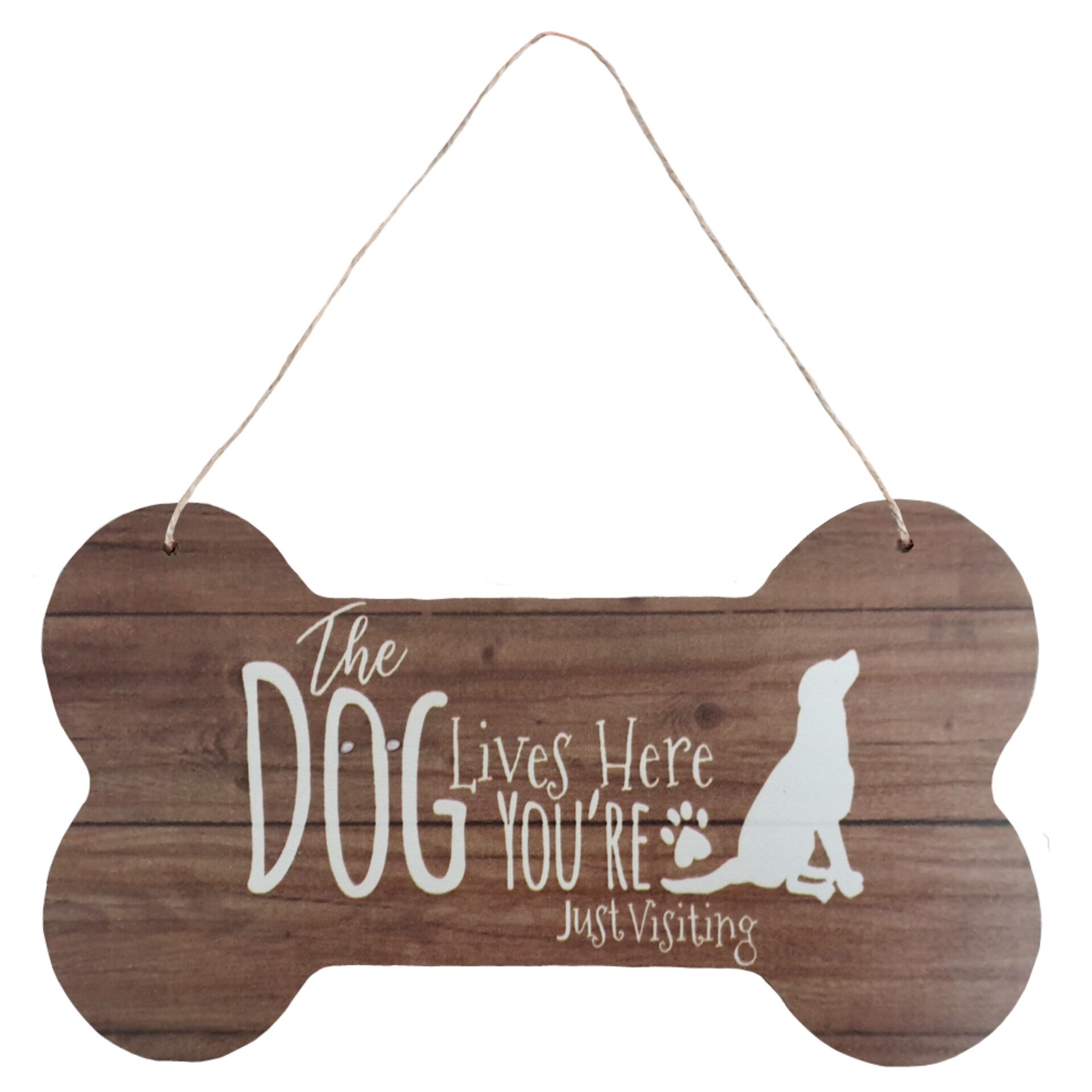 Leuk bordje van hout met de tekst "The dog lives here, you're just visiting". Makkelijk op te hangen door middel van het meegeleverde touwtje.