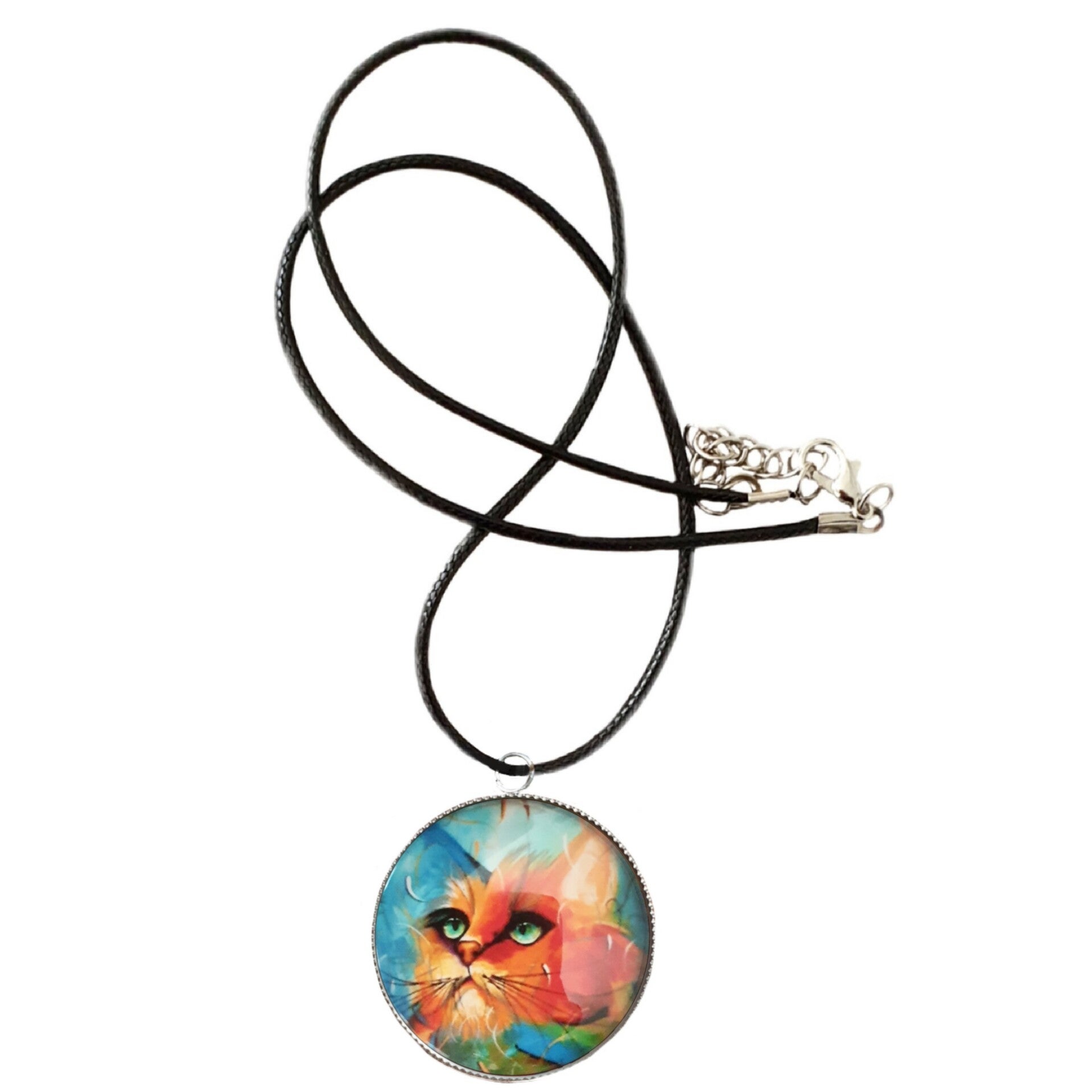 Glazen afbeelding aan een gevlochten koord. De lengte van het koord is 45 cm. De afmetingen van de glazen afbeelding is circa 3 cm diameter.
