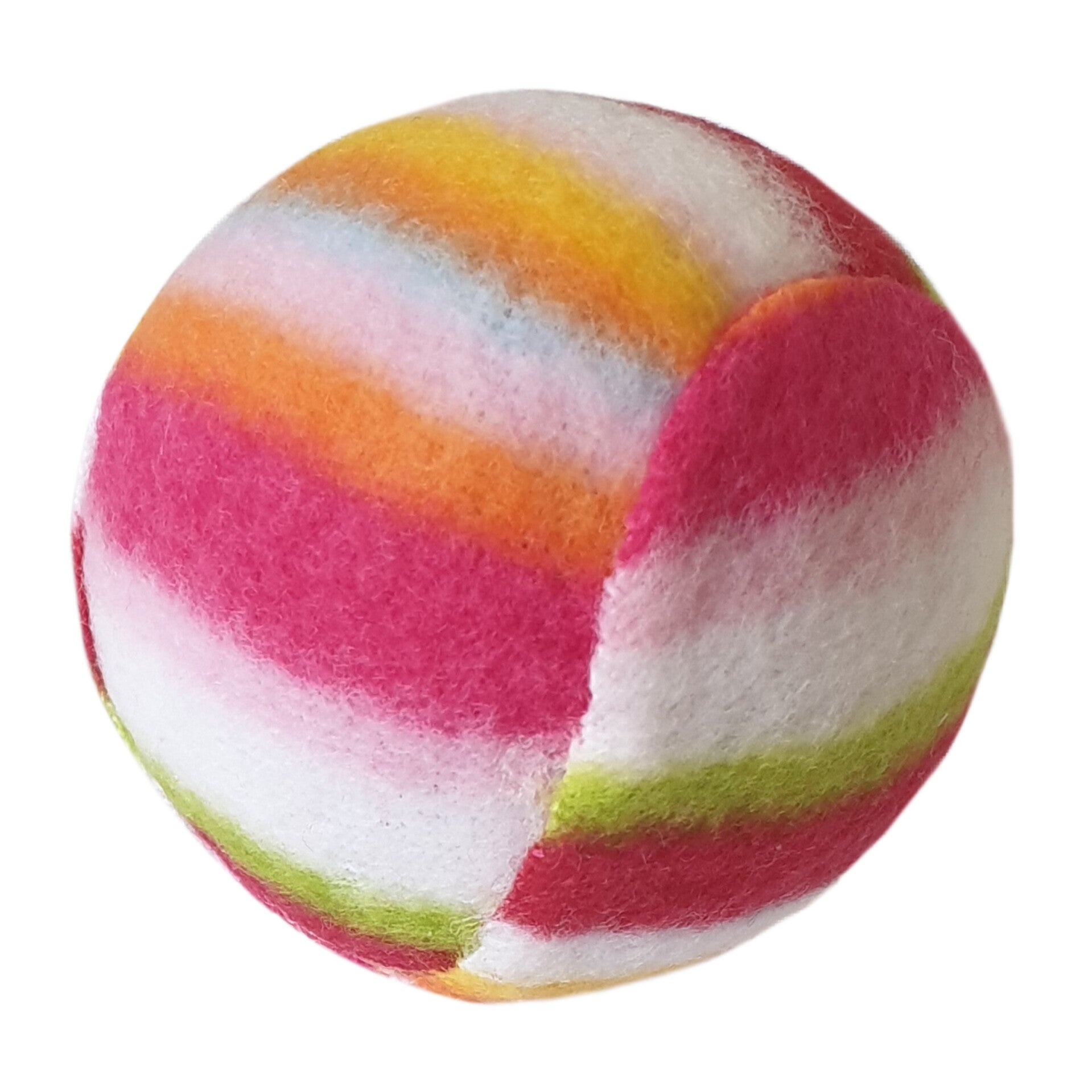 Balletje met vrolijke kleuren gemaakt van plastic, met een pluche omhulsel. In het midden van het balletje zitten ritsels, voor een geluidseffect als de bal rolt.
