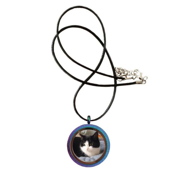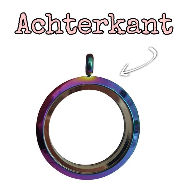 Met deze hanger kun je je huisdier altijd bij je dragen. Het is een kleurig medaillon met een licht glitter effect, gemaakt van roestvrij staal. Aan beide zijden zit glas. De bovenkant kan eenvoudig open geschroefd, waarna er as, haar of een foto in geplaatst kan worden. Het medaillon is waterdicht dankzij een rubberen randje.