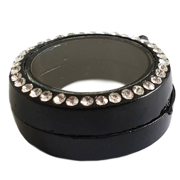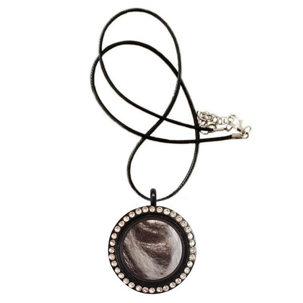 Rond medaillon gemaakt van metaal met een zinklegering, ingelegd met steentjes. De voor -en achterkant zijn van glas.