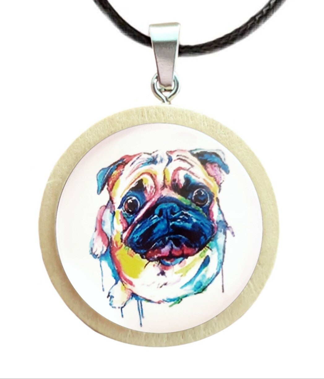 Ketting bestaande uit een glazen afbeelding in een houten basis, aan een gevlochten koord. De lengte van het koord is 45 cm. De afmetingen van de glazen afbeelding is 2,5 cm.