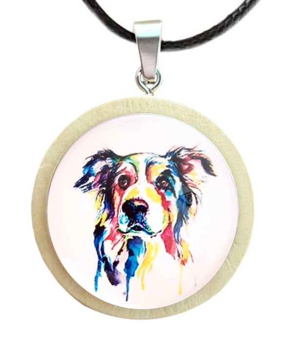 Ketting bestaande uit een glazen afbeelding in een houten basis, aan een gevlochten koord. De lengte van het koord is 45 cm. De afmetingen van de glazen afbeelding is 2,5 cm.