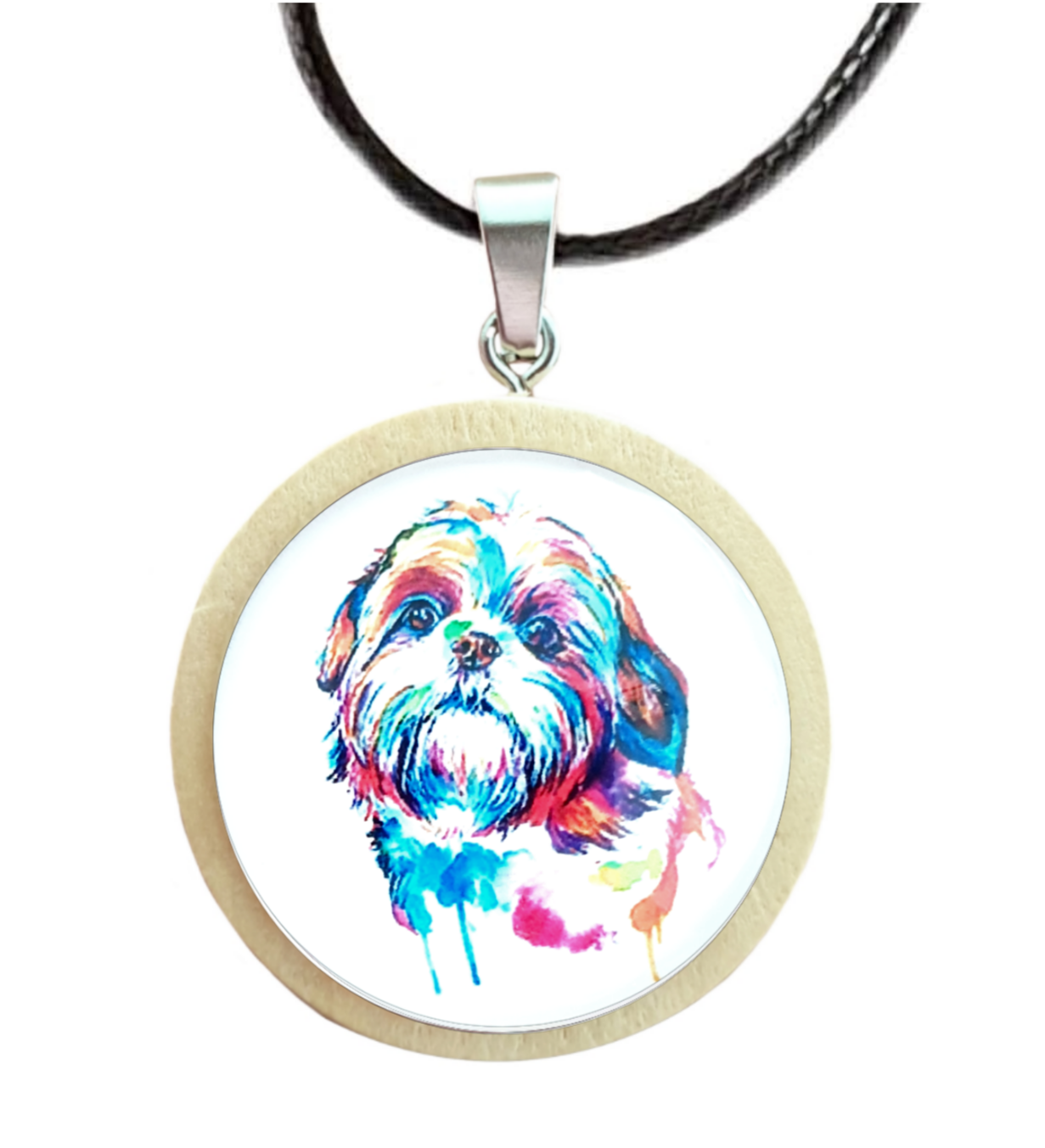 Ketting bestaande uit een glazen afbeelding in een houten basis, aan een gevlochten koord. De lengte van het koord is 45 cm. De afmetingen van de glazen afbeelding is 2,5 cm.