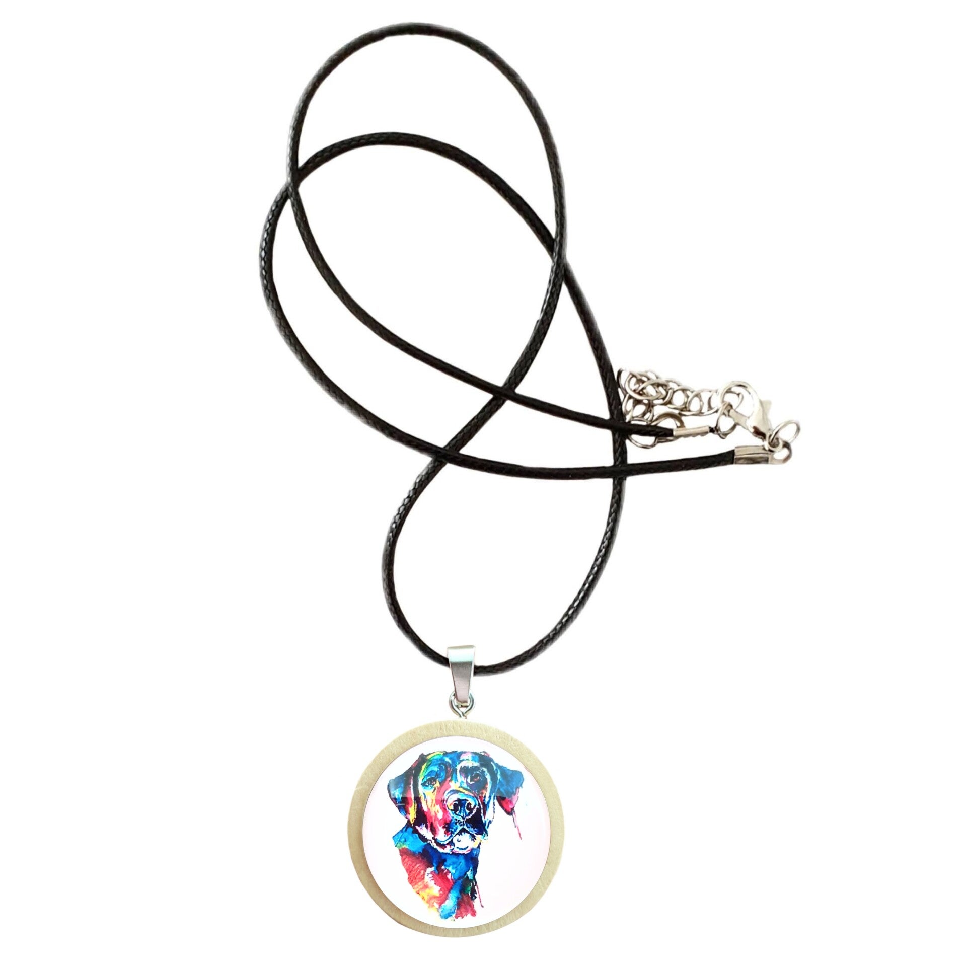 Ketting bestaande uit een glazen afbeelding in een houten basis, aan een gevlochten koord. De lengte van het koord is 45 cm. De afmetingen van de glazen afbeelding is 2,5 cm.