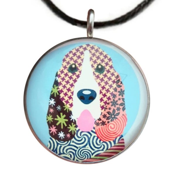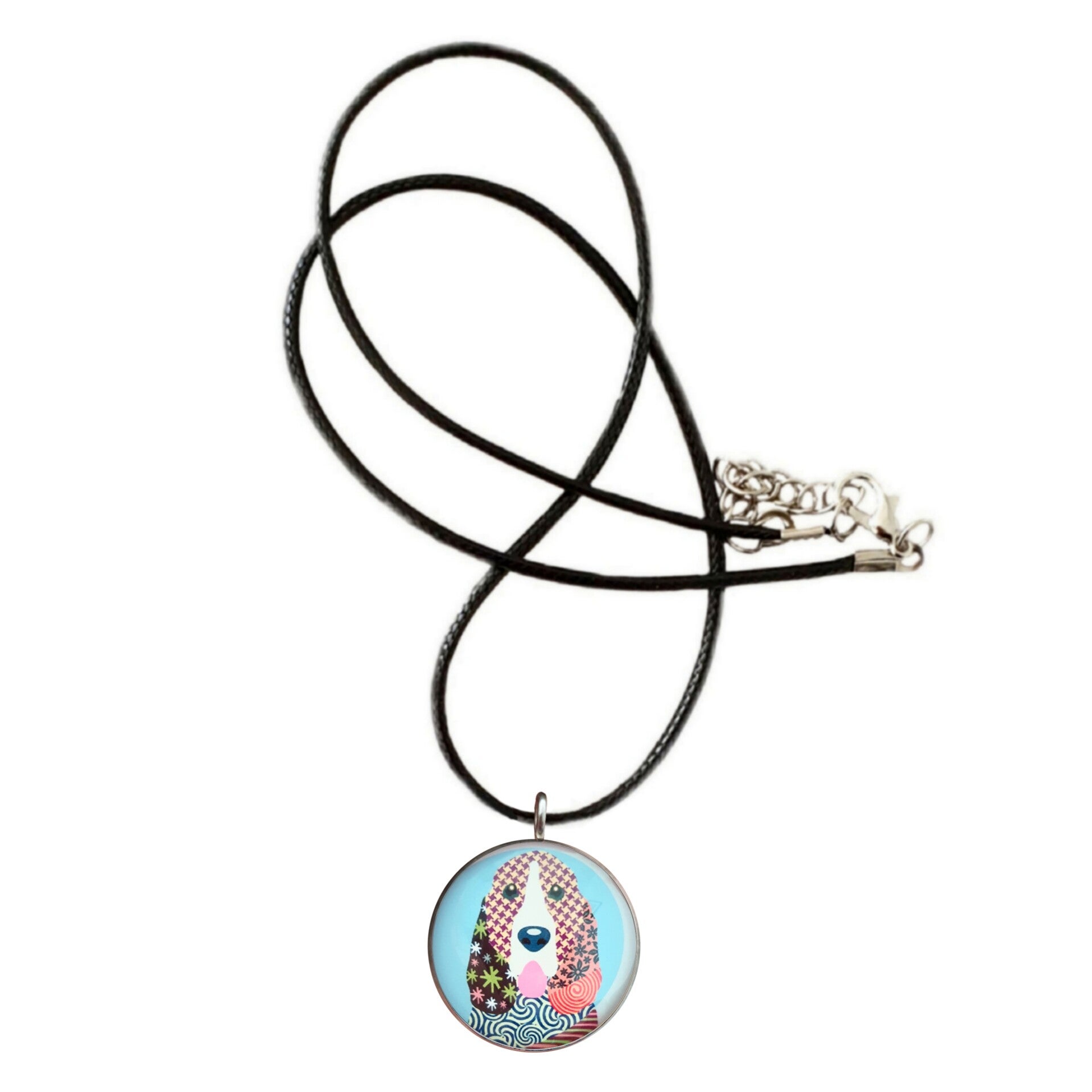 Ketting bestaande uit een glazen afbeelding in een RVS basis, aan een gevlochten koord. De lengte van het koord is 45 cm. De afmetingen van de glazen afbeelding is 2,5 cm.