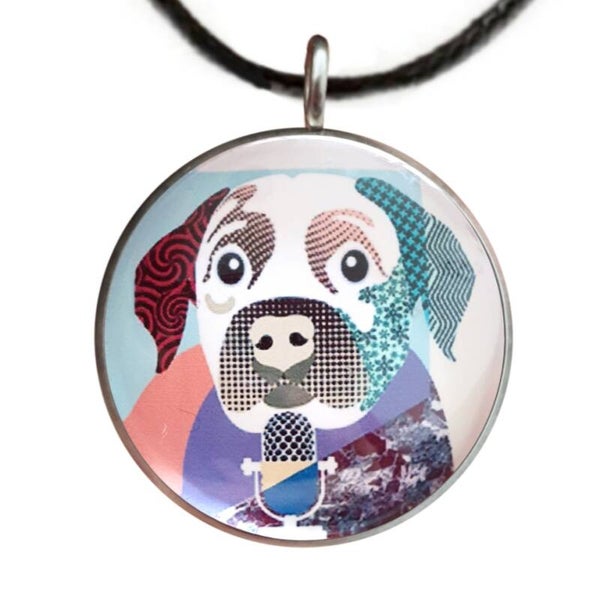 Ketting bestaande uit een glazen afbeelding in een RVS basis, aan een gevlochten koord. De lengte van het koord is 45 cm. De afmetingen van de glazen afbeelding is 2,5 cm.