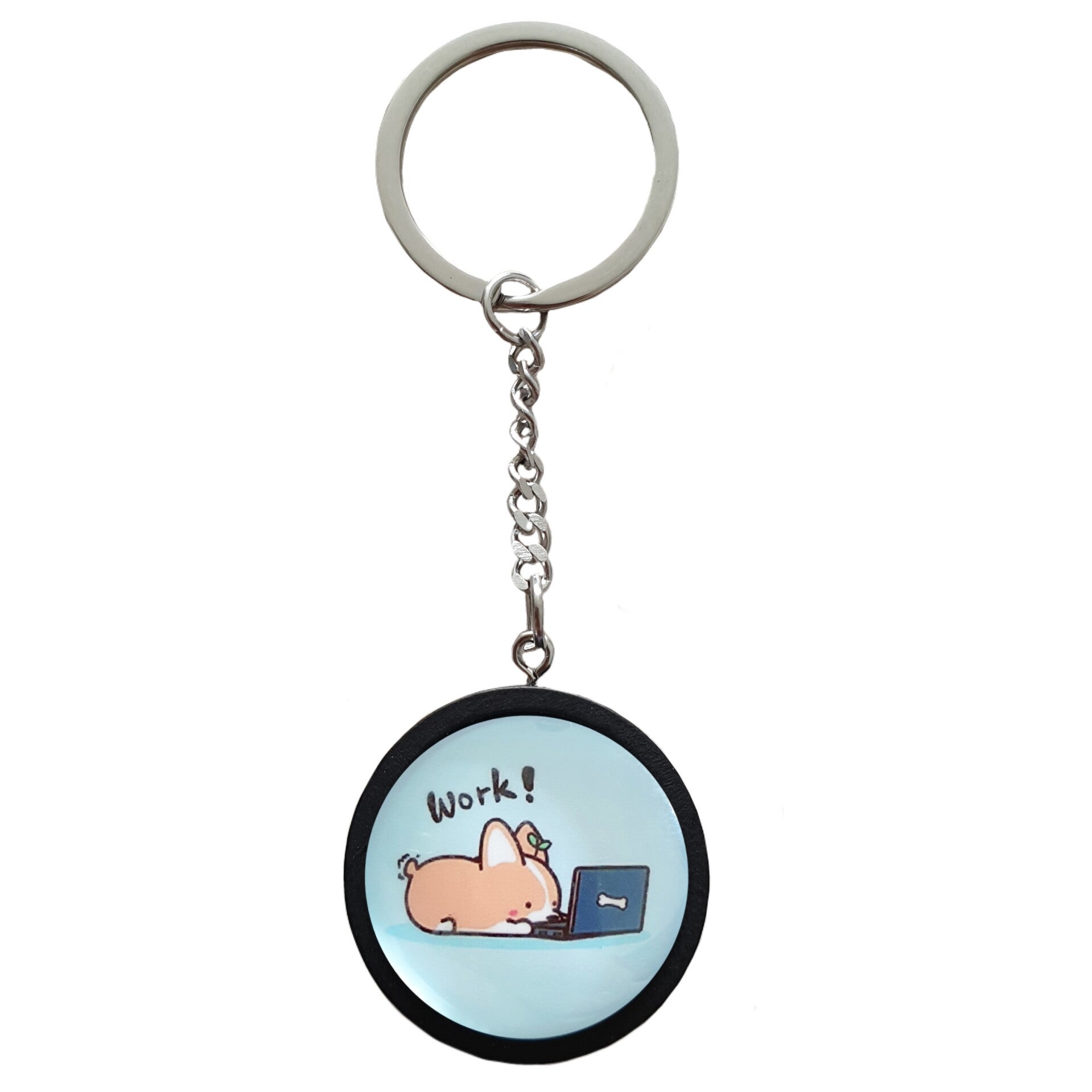 Sleutelhanger van RVS en hout, met een glazen afbeelding.