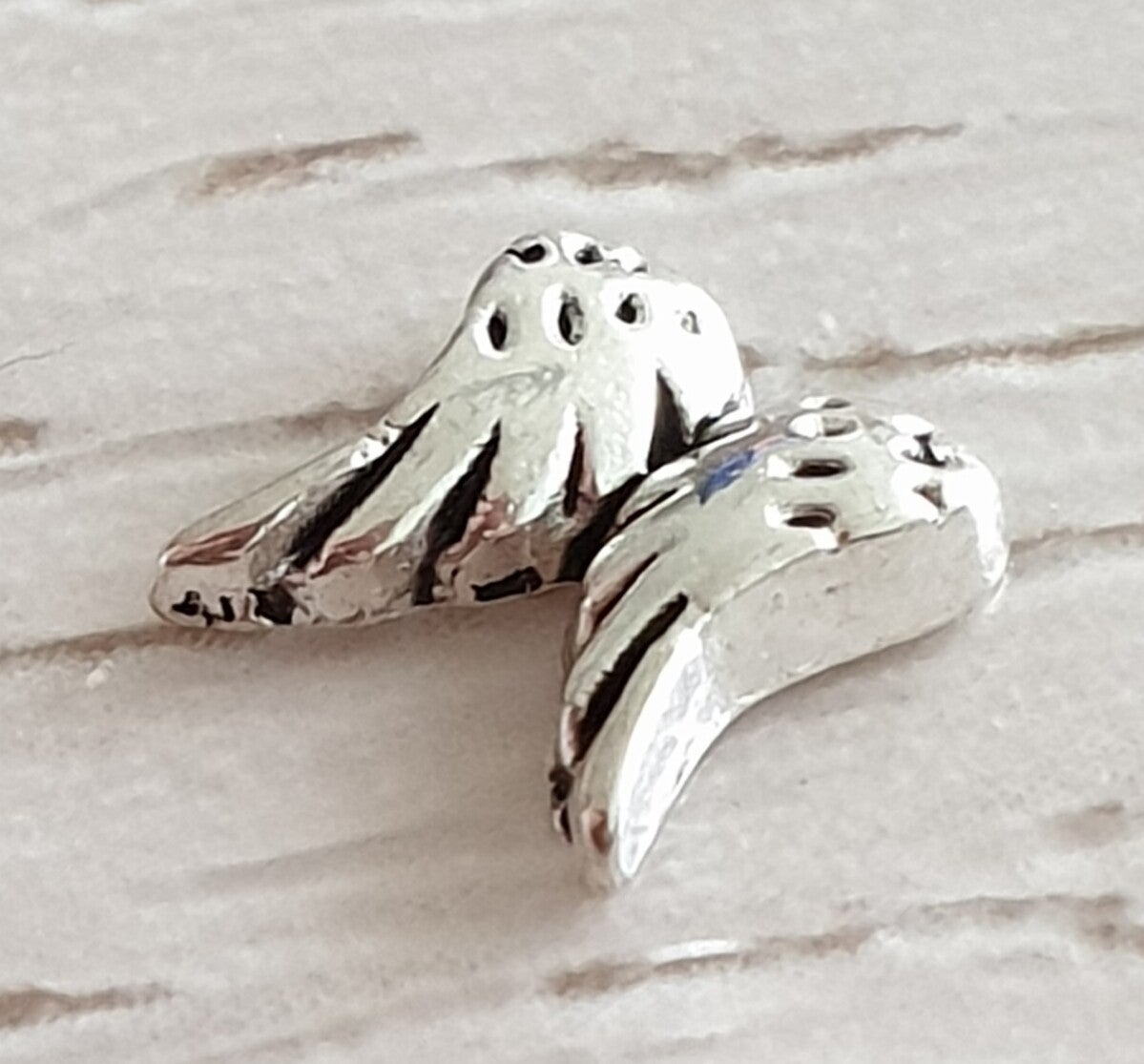 Kleine zilverkleurige bedel van metaal in de vorm van een engelen vleugels.
