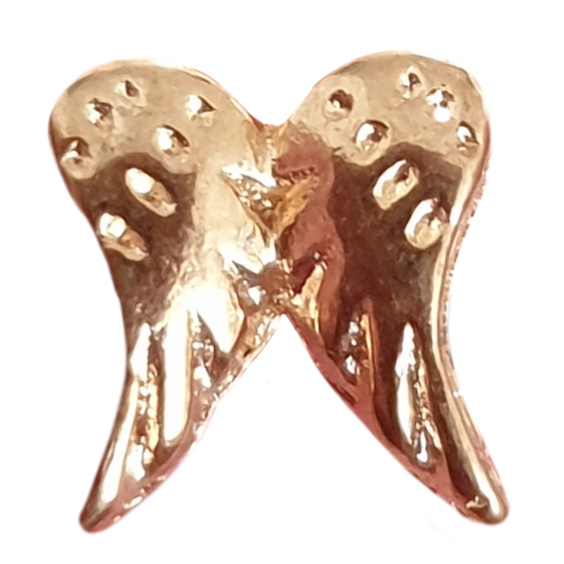 Kleine goudkleurige bedel van metaal in de vorm van een engelen vleugels.