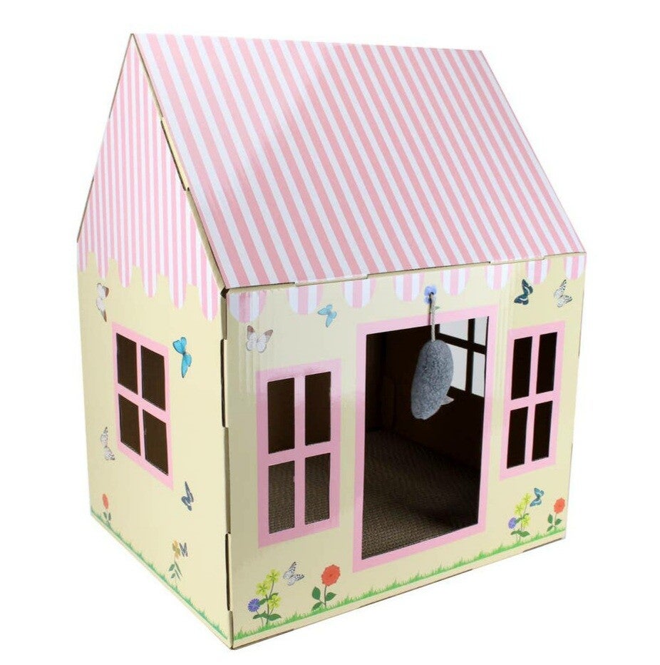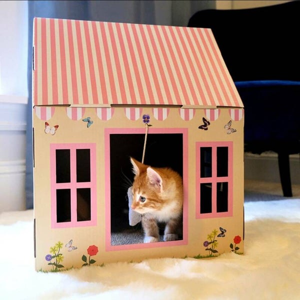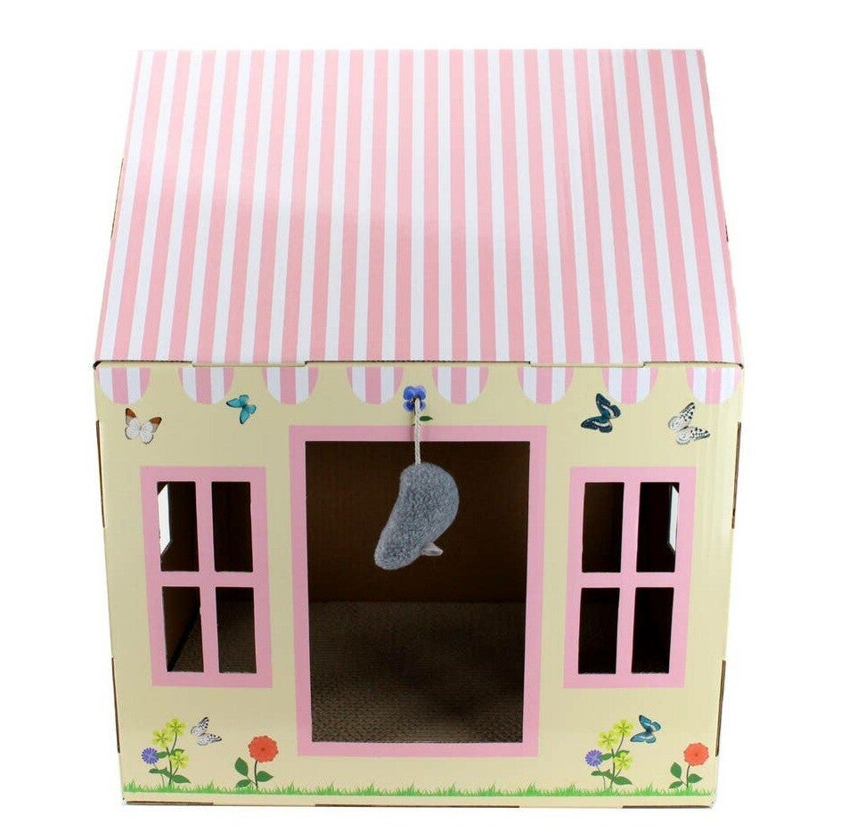 Leuk krab, slaap én speelhuisje van karton, in de vorm van een kasteel. Inclusief een kartonnen scratch board, een zakje catnip en een speelgoed muisje.