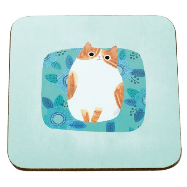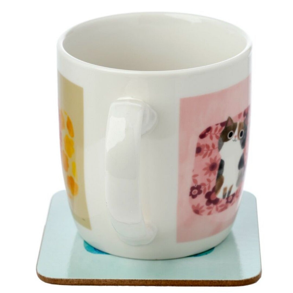Leuke mok gemaakt van keramiek in combinatie met een onderzetter van kurk. De mok is rondom versierd met een kattenprint.