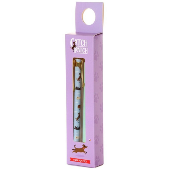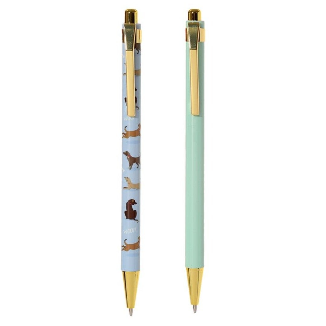 Pennen met zwarte inkt. Eén van de pennen is rondom bedrukt met een hondenprint, de ander is effen gekleurd. Wordt geleverd in een bijpassen doosje.