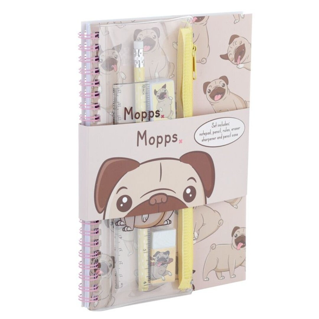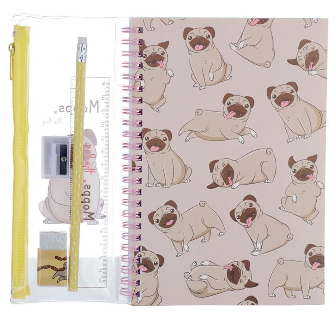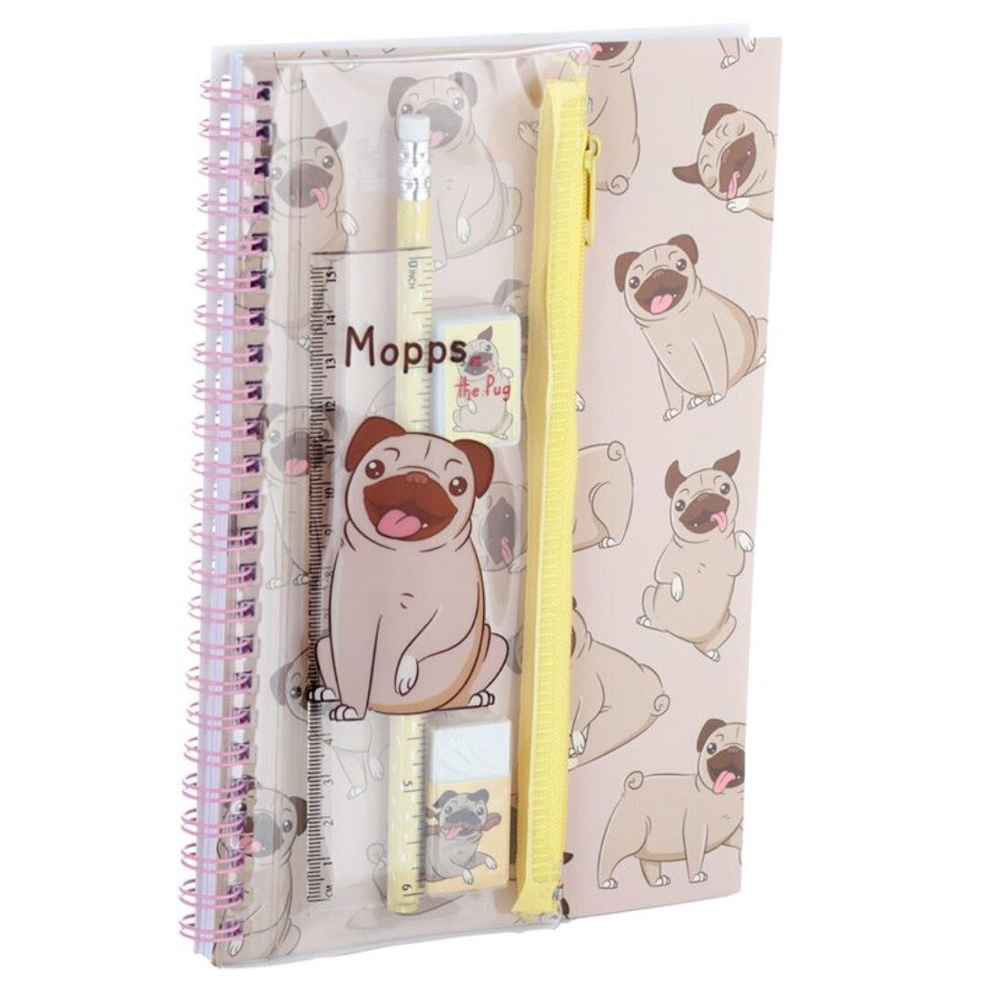 Spiraal gebonden A5 notitieboekje & 6-delige schrijfset. De set bestaat uit een gelinieerd boekje, een gummetje, een liniaal, een slijper, een potlood en een etui.