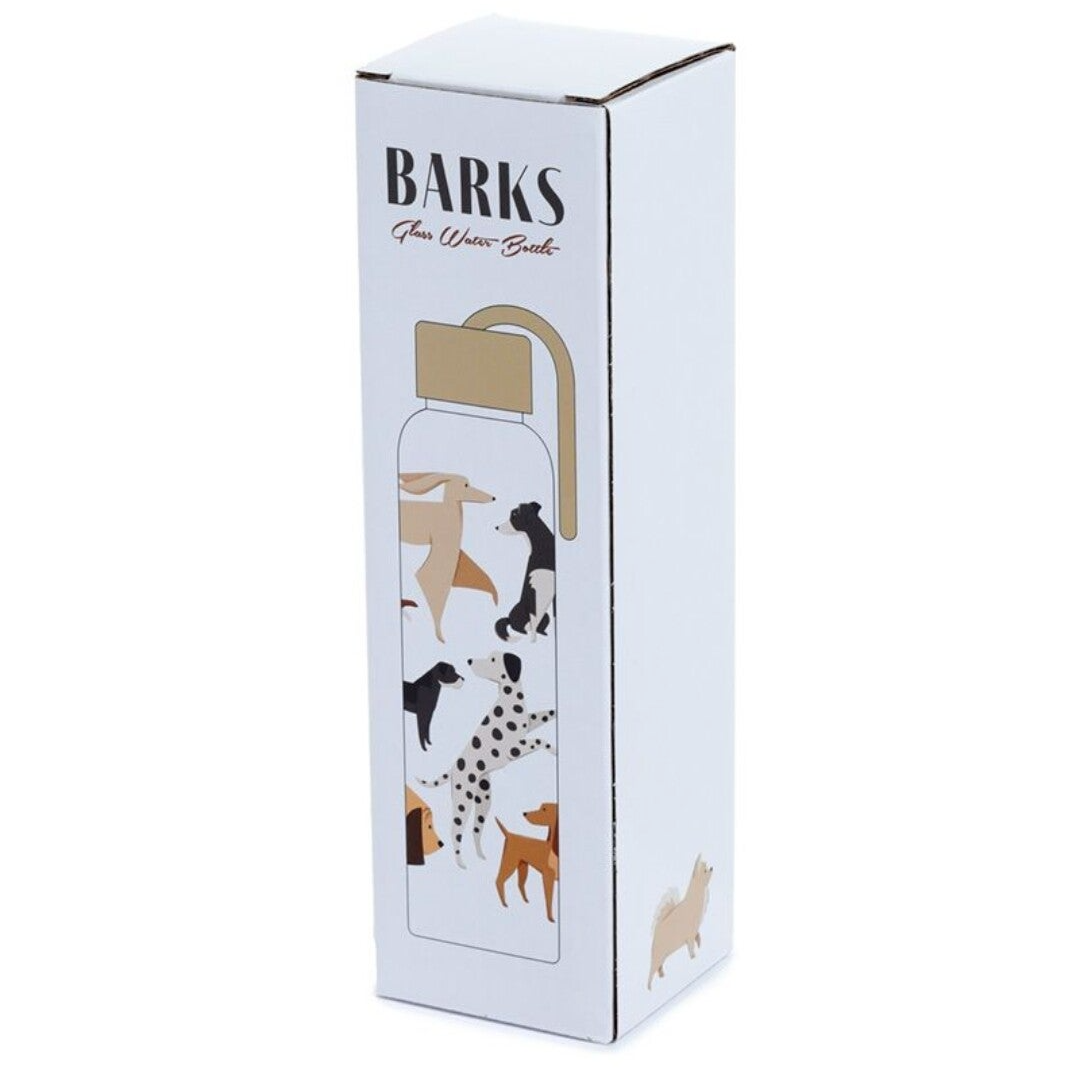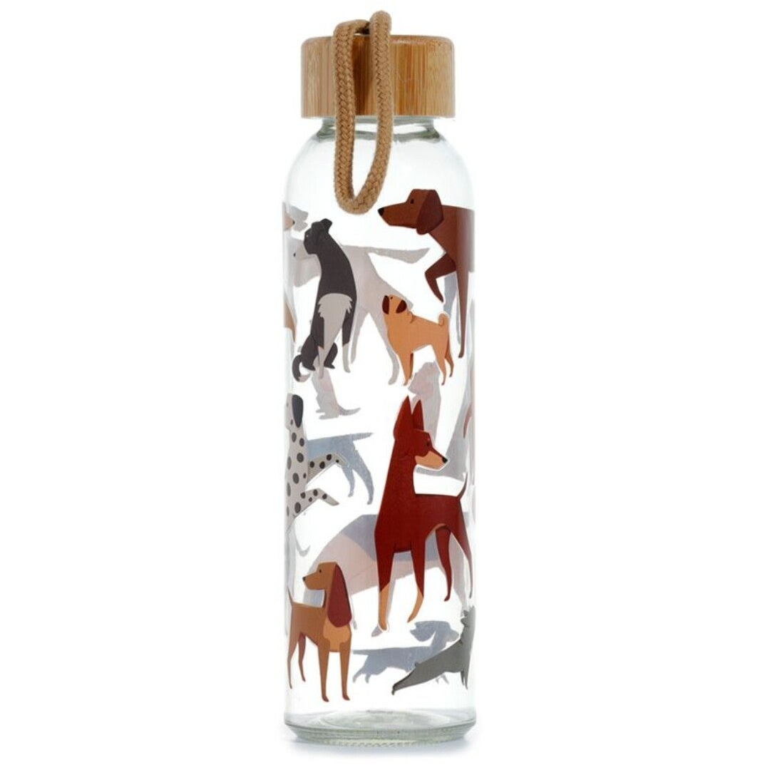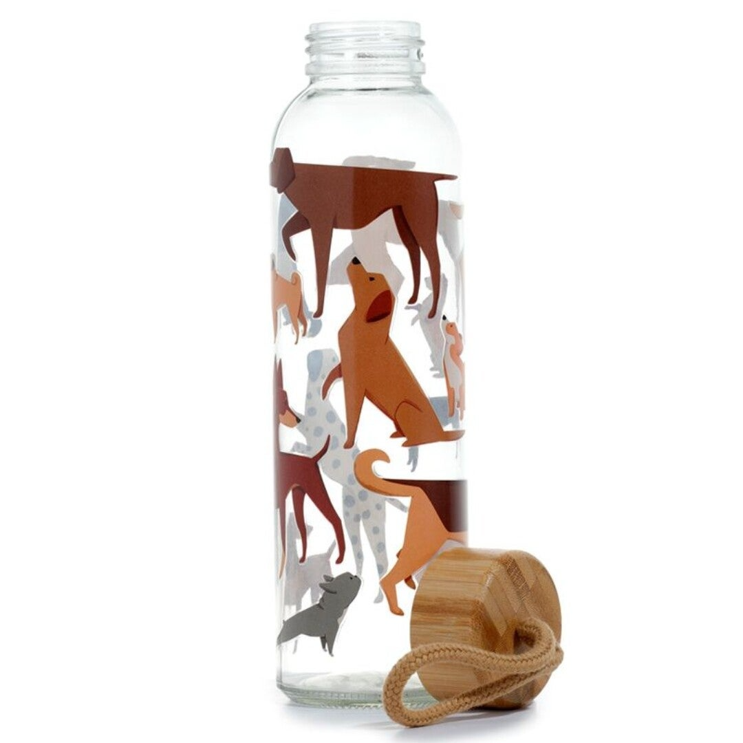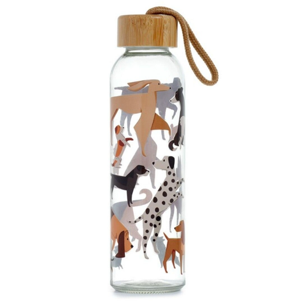 Duurzame glazen waterfles met bamboe deksel. Gemaakt van glas, bamboe, polypropyleen en met een polyester handvat. Geschikt voor vloeistoffen tot 60 graden Celsius. De fles is rondom bedrukt met een leuke hondenprint. De inhoud is 500 ml. Niet geschikt voor de vaatwasser of magnetron.