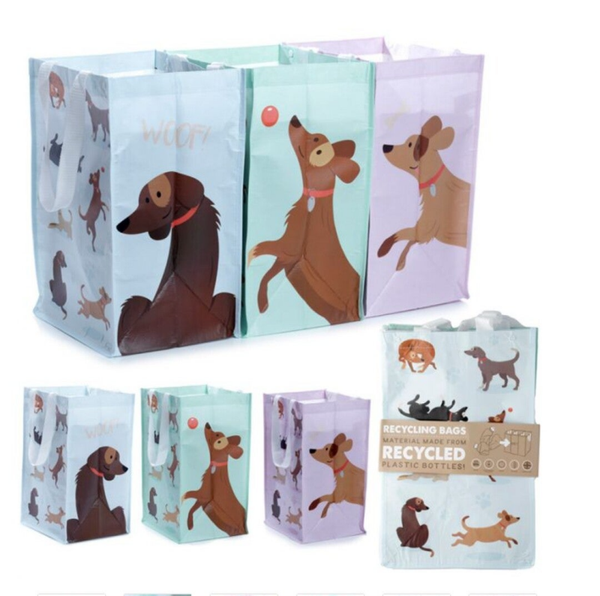 Opberg/ waszakken gemaakt van gerecyclede plastic fessen en met een polypropyleen handvat. De drie zakken zijn aan elkaar te bevestigen door middel van drukknoopjes. De zakken zijn bedrukt met een vrolijke hondenprint en ook apart te gebruiken.