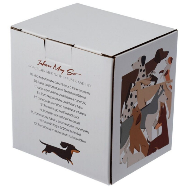 Porselein Mok met uitneembare thee infuser & deksel. Rondom bedrukt met vrolijke hondjes. Vaatwasser -en magnetronbestendig.